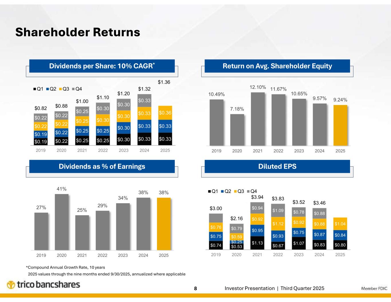 Investor Presentation | Third Quarter 20252 Safe Harbor Statement The statements contained herein that are not historical facts are forward-looking statements based on management’s current expectations and beliefs concerning future developments and their potential effects on us. Such statements involve inherent risks and uncertainties, many of which are difficult to predict and are generally beyond our control. We caution readers that a number of important factors could cause actual results to differ materially from those expressed in, or implied or projected by, such forward-looking statements. These risks and uncertainties include, but are not limited to, the following: macroeconomic, geopolitical, and other challenges and uncertainties, including those related to actual or potential policies and actions from the new U.S. administration, such as tariffs, and reciprocal actions by other countries or regions, significant volatility and disruptions in financial markets, a resurgence of inflation, increases in unemployment rates, increases in interest rates and slowing economic growth or recession in the U.S. and other countries or regions; the impact of any future federal government shutdown and uncertainty regarding the federal government’s debt limit; the impact of changes in financial services industry policies, laws and regulations; regulatory restrictions or adverse regulatory findings affecting our ability to successfully market and price our products to consumers; adverse developments in the financial services industry generally such as bank failures and any related impact on depositor behavior or investor sentiment; the impacts of international hostilities, wars, terrorism or geopolitical events; risks related to the sufficiency of liquidity, including our ability to attract and maintain deposits; the risks related to the development, implementation, use and management of emerging technologies, including artificial intelligence and machine learning; extreme weather, natural disasters and other catastrophic events and their effects on our customers and the economic and business environments in which we operate; current and future economic and market conditions of the local economies in which we conduct operations; declines in housing and commercial real estate prices and changes in the financial performance and/or condition of our borrowers; the market value of our investment securities and possible other-than-temporary impairment of securities held by us due to changes in credit quality or rates; the availability of, and cost of, sources of funding and the demand for our products; the possibility that our recorded goodwill could become impaired, which may have an adverse impact on our earnings and capital; the costs or effects of mergers, acquisitions or dispositions we may make, as well as whether we are able to obtain any required governmental approvals in connection with any such activities, or identify and complete favorable transactions in the future, and/or realize the anticipated financial and business benefits; the volatility of the stock market and its impact on our stock price and our ability to conduct acquisitions; the regulatory and financial impacts associated with exceeding $10 billion in total assets; the ability to execute our business plan in new markets; our future operating or financial performance, including our outlook for future growth; changes in the level and direction of our nonperforming assets and charge-offs and the appropriateness of the allowance for credit losses; the effectiveness of us managing the mix of earning assets and in improving, resolving or liquidating lower-quality assets; changes in accounting standards and practices; changes in consumer spending, borrowing and savings habits; the effects of changes in the level or cost of checking or savings account deposits on our funding costs and net interest margin; increasing noninterest expense and its impact on our financial performance; competition and innovation with respect to financial products and services by banks, financial institutions and non-traditional competitors including retail businesses and technology companies; the challenges of attracting, integrating and retaining key employees; the impact of the 2023 cyber security ransomware incident, including the pending litigation, on our operations and reputation; the vulnerability of our operational or security systems or infrastructure, the systems of third-party vendors or other service providers with whom we contract, and our customers to unauthorized access, computer viruses, phishing schemes, spam attacks, human error, natural disasters, power loss and data/security breaches and the cost to defend against and respond to such incidents; increased data security risks due to work from home arrangements and email vulnerability; failure to safeguard personal information, and any resulting litigation; the effect of a fall in stock market prices on our brokerage and wealth management businesses; the emergence or continuation of widespread health emergencies or pandemics; potential judgments, orders, settlements, penalties, fines and reputational damage resulting from pending or future litigation and regulatory investigations, proceedings and enforcement actions; and our ability to manage the risks involved in the foregoing. There can be no assurance that future developments affecting us will be the same as those anticipated by management. Additional factors that could cause results to differ materially from those described above can be found in our filings with the U.S. Securities and Exchange Commission, including without limitation the “Risk Factors” Section of TriCo’s Annual Report on Form 10-K for the year ended December 31, 2024, Such filings are also available in the “Investor Relations” section of our website, https://www.tcbk.com/investor-relations. Annualized, pro forma, projections and estimates are not forecasts 