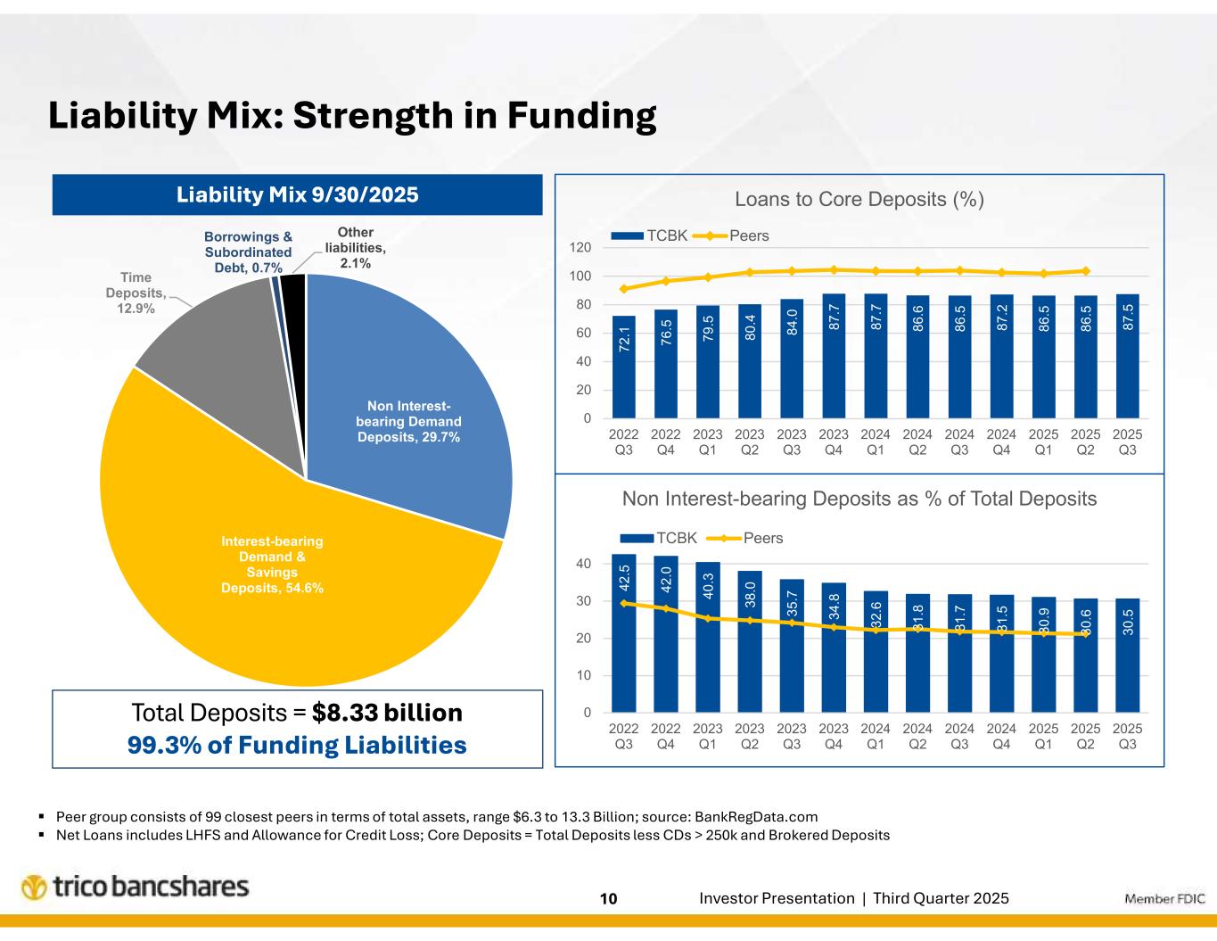Investor Presentation | Third Quarter 20252 Safe Harbor Statement The statements contained herein that are not historical facts are forward-looking statements based on management’s current expectations and beliefs concerning future developments and their potential effects on us. Such statements involve inherent risks and uncertainties, many of which are difficult to predict and are generally beyond our control. We caution readers that a number of important factors could cause actual results to differ materially from those expressed in, or implied or projected by, such forward-looking statements. These risks and uncertainties include, but are not limited to, the following: macroeconomic, geopolitical, and other challenges and uncertainties, including those related to actual or potential policies and actions from the new U.S. administration, such as tariffs, and reciprocal actions by other countries or regions, significant volatility and disruptions in financial markets, a resurgence of inflation, increases in unemployment rates, increases in interest rates and slowing economic growth or recession in the U.S. and other countries or regions; the impact of any future federal government shutdown and uncertainty regarding the federal government’s debt limit; the impact of changes in financial services industry policies, laws and regulations; regulatory restrictions or adverse regulatory findings affecting our ability to successfully market and price our products to consumers; adverse developments in the financial services industry generally such as bank failures and any related impact on depositor behavior or investor sentiment; the impacts of international hostilities, wars, terrorism or geopolitical events; risks related to the sufficiency of liquidity, including our ability to attract and maintain deposits; the risks related to the development, implementation, use and management of emerging technologies, including artificial intelligence and machine learning; extreme weather, natural disasters and other catastrophic events and their effects on our customers and the economic and business environments in which we operate; current and future economic and market conditions of the local economies in which we conduct operations; declines in housing and commercial real estate prices and changes in the financial performance and/or condition of our borrowers; the market value of our investment securities and possible other-than-temporary impairment of securities held by us due to changes in credit quality or rates; the availability of, and cost of, sources of funding and the demand for our products; the possibility that our recorded goodwill could become impaired, which may have an adverse impact on our earnings and capital; the costs or effects of mergers, acquisitions or dispositions we may make, as well as whether we are able to obtain any required governmental approvals in connection with any such activities, or identify and complete favorable transactions in the future, and/or realize the anticipated financial and business benefits; the volatility of the stock market and its impact on our stock price and our ability to conduct acquisitions; the regulatory and financial impacts associated with exceeding $10 billion in total assets; the ability to execute our business plan in new markets; our future operating or financial performance, including our outlook for future growth; changes in the level and direction of our nonperforming assets and charge-offs and the appropriateness of the allowance for credit losses; the effectiveness of us managing the mix of earning assets and in improving, resolving or liquidating lower-quality assets; changes in accounting standards and practices; changes in consumer spending, borrowing and savings habits; the effects of changes in the level or cost of checking or savings account deposits on our funding costs and net interest margin; increasing noninterest expense and its impact on our financial performance; competition and innovation with respect to financial products and services by banks, financial institutions and non-traditional competitors including retail businesses and technology companies; the challenges of attracting, integrating and retaining key employees; the impact of the 2023 cyber security ransomware incident, including the pending litigation, on our operations and reputation; the vulnerability of our operational or security systems or infrastructure, the systems of third-party vendors or other service providers with whom we contract, and our customers to unauthorized access, computer viruses, phishing schemes, spam attacks, human error, natural disasters, power loss and data/security breaches and the cost to defend against and respond to such incidents; increased data security risks due to work from home arrangements and email vulnerability; failure to safeguard personal information, and any resulting litigation; the effect of a fall in stock market prices on our brokerage and wealth management businesses; the emergence or continuation of widespread health emergencies or pandemics; potential judgments, orders, settlements, penalties, fines and reputational damage resulting from pending or future litigation and regulatory investigations, proceedings and enforcement actions; and our ability to manage the risks involved in the foregoing. There can be no assurance that future developments affecting us will be the same as those anticipated by management. Additional factors that could cause results to differ materially from those described above can be found in our filings with the U.S. Securities and Exchange Commission, including without limitation the “Risk Factors” Section of TriCo’s Annual Report on Form 10-K for the year ended December 31, 2024, Such filings are also available in the “Investor Relations” section of our website, https://www.tcbk.com/investor-relations. Annualized, pro forma, projections and estimates are not forecasts 