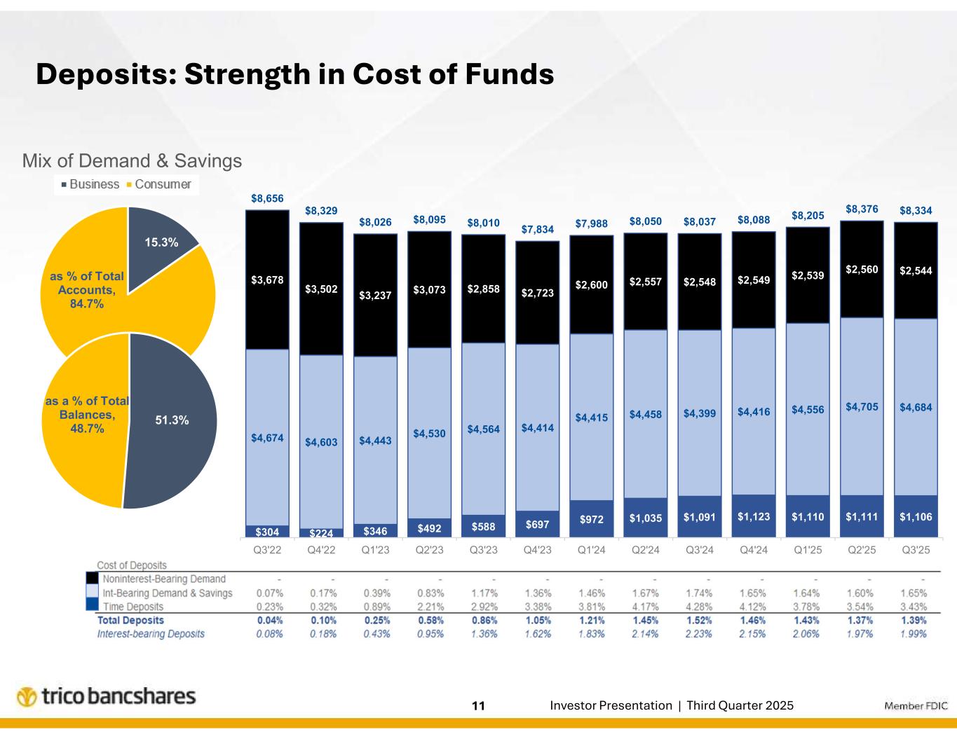 Investor Presentation | Third Quarter 20252 Safe Harbor Statement The statements contained herein that are not historical facts are forward-looking statements based on management’s current expectations and beliefs concerning future developments and their potential effects on us. Such statements involve inherent risks and uncertainties, many of which are difficult to predict and are generally beyond our control. We caution readers that a number of important factors could cause actual results to differ materially from those expressed in, or implied or projected by, such forward-looking statements. These risks and uncertainties include, but are not limited to, the following: macroeconomic, geopolitical, and other challenges and uncertainties, including those related to actual or potential policies and actions from the new U.S. administration, such as tariffs, and reciprocal actions by other countries or regions, significant volatility and disruptions in financial markets, a resurgence of inflation, increases in unemployment rates, increases in interest rates and slowing economic growth or recession in the U.S. and other countries or regions; the impact of any future federal government shutdown and uncertainty regarding the federal government’s debt limit; the impact of changes in financial services industry policies, laws and regulations; regulatory restrictions or adverse regulatory findings affecting our ability to successfully market and price our products to consumers; adverse developments in the financial services industry generally such as bank failures and any related impact on depositor behavior or investor sentiment; the impacts of international hostilities, wars, terrorism or geopolitical events; risks related to the sufficiency of liquidity, including our ability to attract and maintain deposits; the risks related to the development, implementation, use and management of emerging technologies, including artificial intelligence and machine learning; extreme weather, natural disasters and other catastrophic events and their effects on our customers and the economic and business environments in which we operate; current and future economic and market conditions of the local economies in which we conduct operations; declines in housing and commercial real estate prices and changes in the financial performance and/or condition of our borrowers; the market value of our investment securities and possible other-than-temporary impairment of securities held by us due to changes in credit quality or rates; the availability of, and cost of, sources of funding and the demand for our products; the possibility that our recorded goodwill could become impaired, which may have an adverse impact on our earnings and capital; the costs or effects of mergers, acquisitions or dispositions we may make, as well as whether we are able to obtain any required governmental approvals in connection with any such activities, or identify and complete favorable transactions in the future, and/or realize the anticipated financial and business benefits; the volatility of the stock market and its impact on our stock price and our ability to conduct acquisitions; the regulatory and financial impacts associated with exceeding $10 billion in total assets; the ability to execute our business plan in new markets; our future operating or financial performance, including our outlook for future growth; changes in the level and direction of our nonperforming assets and charge-offs and the appropriateness of the allowance for credit losses; the effectiveness of us managing the mix of earning assets and in improving, resolving or liquidating lower-quality assets; changes in accounting standards and practices; changes in consumer spending, borrowing and savings habits; the effects of changes in the level or cost of checking or savings account deposits on our funding costs and net interest margin; increasing noninterest expense and its impact on our financial performance; competition and innovation with respect to financial products and services by banks, financial institutions and non-traditional competitors including retail businesses and technology companies; the challenges of attracting, integrating and retaining key employees; the impact of the 2023 cyber security ransomware incident, including the pending litigation, on our operations and reputation; the vulnerability of our operational or security systems or infrastructure, the systems of third-party vendors or other service providers with whom we contract, and our customers to unauthorized access, computer viruses, phishing schemes, spam attacks, human error, natural disasters, power loss and data/security breaches and the cost to defend against and respond to such incidents; increased data security risks due to work from home arrangements and email vulnerability; failure to safeguard personal information, and any resulting litigation; the effect of a fall in stock market prices on our brokerage and wealth management businesses; the emergence or continuation of widespread health emergencies or pandemics; potential judgments, orders, settlements, penalties, fines and reputational damage resulting from pending or future litigation and regulatory investigations, proceedings and enforcement actions; and our ability to manage the risks involved in the foregoing. There can be no assurance that future developments affecting us will be the same as those anticipated by management. Additional factors that could cause results to differ materially from those described above can be found in our filings with the U.S. Securities and Exchange Commission, including without limitation the “Risk Factors” Section of TriCo’s Annual Report on Form 10-K for the year ended December 31, 2024, Such filings are also available in the “Investor Relations” section of our website, https://www.tcbk.com/investor-relations. Annualized, pro forma, projections and estimates are not forecasts 