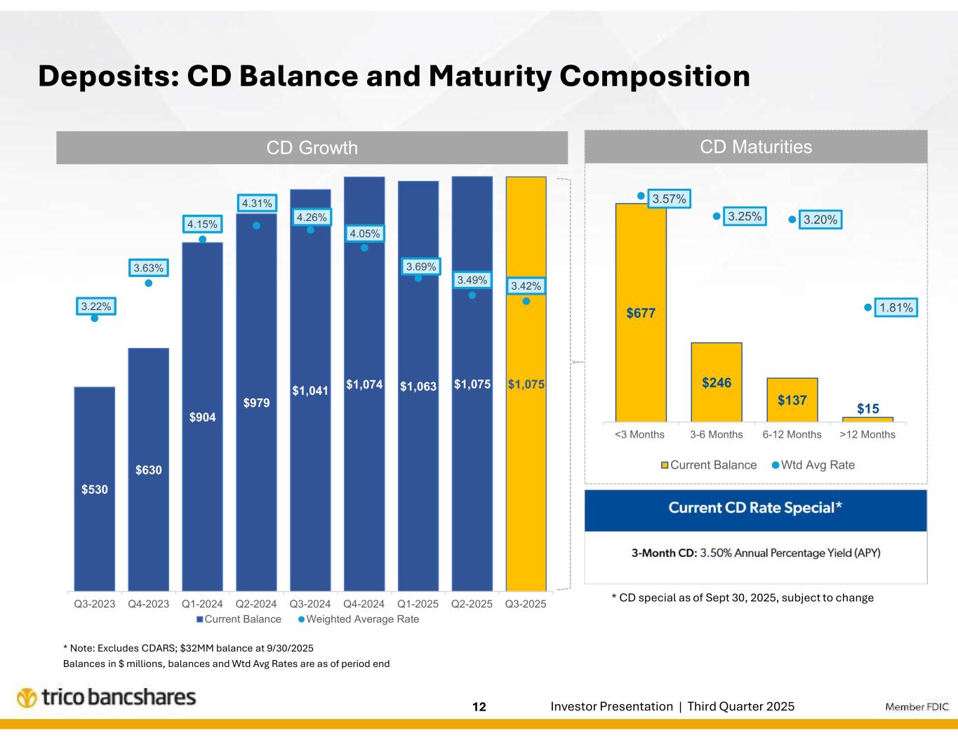 Investor Presentation | Third Quarter 20252 Safe Harbor Statement The statements contained herein that are not historical facts are forward-looking statements based on management’s current expectations and beliefs concerning future developments and their potential effects on us. Such statements involve inherent risks and uncertainties, many of which are difficult to predict and are generally beyond our control. We caution readers that a number of important factors could cause actual results to differ materially from those expressed in, or implied or projected by, such forward-looking statements. These risks and uncertainties include, but are not limited to, the following: macroeconomic, geopolitical, and other challenges and uncertainties, including those related to actual or potential policies and actions from the new U.S. administration, such as tariffs, and reciprocal actions by other countries or regions, significant volatility and disruptions in financial markets, a resurgence of inflation, increases in unemployment rates, increases in interest rates and slowing economic growth or recession in the U.S. and other countries or regions; the impact of any future federal government shutdown and uncertainty regarding the federal government’s debt limit; the impact of changes in financial services industry policies, laws and regulations; regulatory restrictions or adverse regulatory findings affecting our ability to successfully market and price our products to consumers; adverse developments in the financial services industry generally such as bank failures and any related impact on depositor behavior or investor sentiment; the impacts of international hostilities, wars, terrorism or geopolitical events; risks related to the sufficiency of liquidity, including our ability to attract and maintain deposits; the risks related to the development, implementation, use and management of emerging technologies, including artificial intelligence and machine learning; extreme weather, natural disasters and other catastrophic events and their effects on our customers and the economic and business environments in which we operate; current and future economic and market conditions of the local economies in which we conduct operations; declines in housing and commercial real estate prices and changes in the financial performance and/or condition of our borrowers; the market value of our investment securities and possible other-than-temporary impairment of securities held by us due to changes in credit quality or rates; the availability of, and cost of, sources of funding and the demand for our products; the possibility that our recorded goodwill could become impaired, which may have an adverse impact on our earnings and capital; the costs or effects of mergers, acquisitions or dispositions we may make, as well as whether we are able to obtain any required governmental approvals in connection with any such activities, or identify and complete favorable transactions in the future, and/or realize the anticipated financial and business benefits; the volatility of the stock market and its impact on our stock price and our ability to conduct acquisitions; the regulatory and financial impacts associated with exceeding $10 billion in total assets; the ability to execute our business plan in new markets; our future operating or financial performance, including our outlook for future growth; changes in the level and direction of our nonperforming assets and charge-offs and the appropriateness of the allowance for credit losses; the effectiveness of us managing the mix of earning assets and in improving, resolving or liquidating lower-quality assets; changes in accounting standards and practices; changes in consumer spending, borrowing and savings habits; the effects of changes in the level or cost of checking or savings account deposits on our funding costs and net interest margin; increasing noninterest expense and its impact on our financial performance; competition and innovation with respect to financial products and services by banks, financial institutions and non-traditional competitors including retail businesses and technology companies; the challenges of attracting, integrating and retaining key employees; the impact of the 2023 cyber security ransomware incident, including the pending litigation, on our operations and reputation; the vulnerability of our operational or security systems or infrastructure, the systems of third-party vendors or other service providers with whom we contract, and our customers to unauthorized access, computer viruses, phishing schemes, spam attacks, human error, natural disasters, power loss and data/security breaches and the cost to defend against and respond to such incidents; increased data security risks due to work from home arrangements and email vulnerability; failure to safeguard personal information, and any resulting litigation; the effect of a fall in stock market prices on our brokerage and wealth management businesses; the emergence or continuation of widespread health emergencies or pandemics; potential judgments, orders, settlements, penalties, fines and reputational damage resulting from pending or future litigation and regulatory investigations, proceedings and enforcement actions; and our ability to manage the risks involved in the foregoing. There can be no assurance that future developments affecting us will be the same as those anticipated by management. Additional factors that could cause results to differ materially from those described above can be found in our filings with the U.S. Securities and Exchange Commission, including without limitation the “Risk Factors” Section of TriCo’s Annual Report on Form 10-K for the year ended December 31, 2024, Such filings are also available in the “Investor Relations” section of our website, https://www.tcbk.com/investor-relations. Annualized, pro forma, projections and estimates are not forecasts 