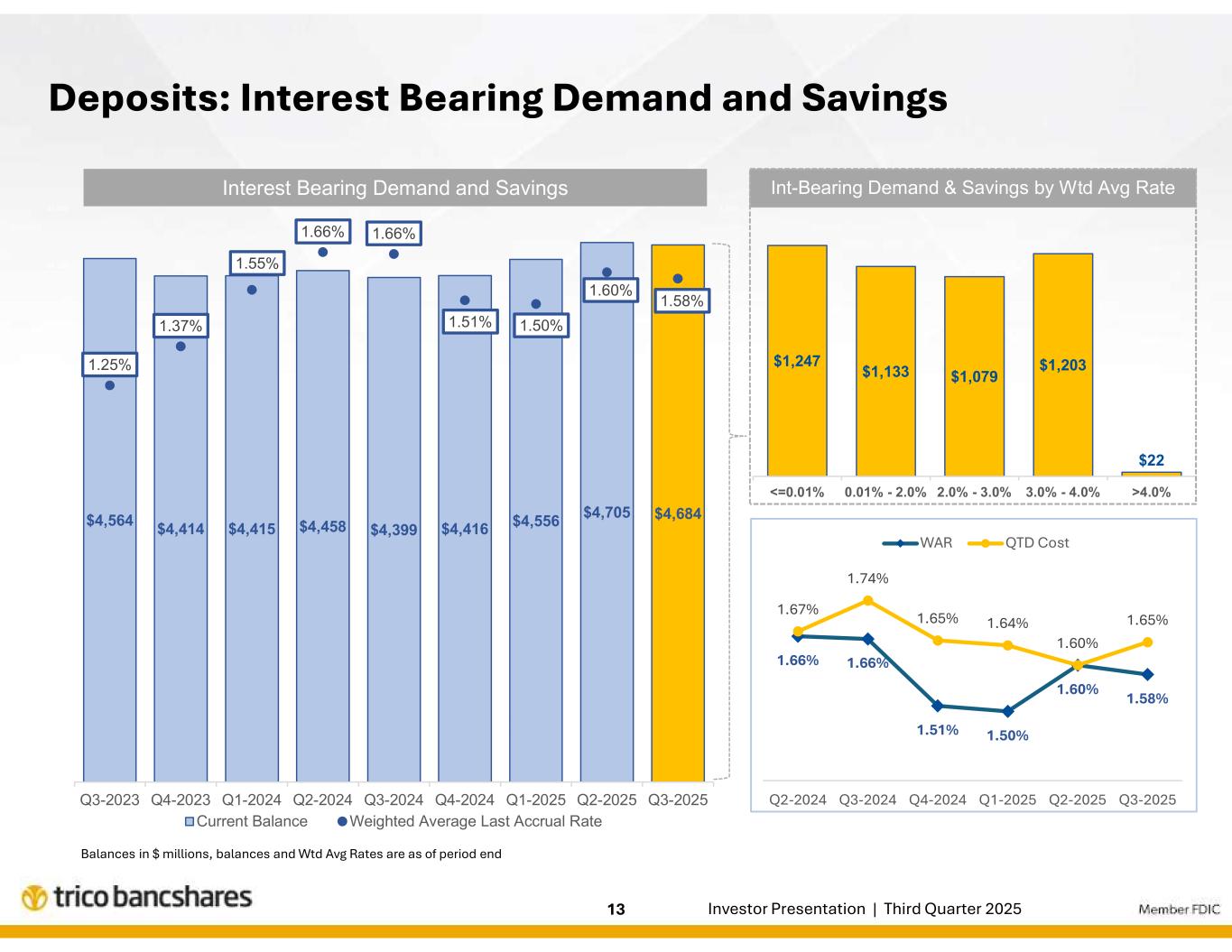 Investor Presentation | Third Quarter 202512 $677 $246 $137 $15 3.57% 3.25% 3.20% 1.81% 0.00% 0.50% 1.00% 1.50% 2.00% 2.50% 3.00% 3.50% 4.00% $0 $100 $200 $300 $400 $500 $600 $700 <3 Months 3-6 Months 6-12 Months >12 Months Current Balance Wtd Avg Rate $530 $630 $904 $979 $1,041 $1,074 $1,063 $1,075 $1,075 3.22% 3.63% 4.15% 4.31% 4.26% 4.05% 3.69% 3.49% 3.42% 0.00% 0.50% 1.00% 1.50% 2.00% 2.50% 3.00% 3.50% 4.00% 4.50% 5.00% $0.00 $200.00 $400.00 $600.00 $800.00 $1,000.00 Q3-2023 Q4-2023 Q1-2024 Q2-2024 Q3-2024 Q4-2024 Q1-2025 Q2-2025 Q3-2025 Current Balance Weighted Average Rate Deposits: CD Balance and Maturity Composition * Note: Excludes CDARS; $32MM balance at 9/30/2025 * CD special as of Sept 30, 2025, subject to change CD Growth Balances in $ millions, balances and Wtd Avg Rates are as of period end CD Maturities