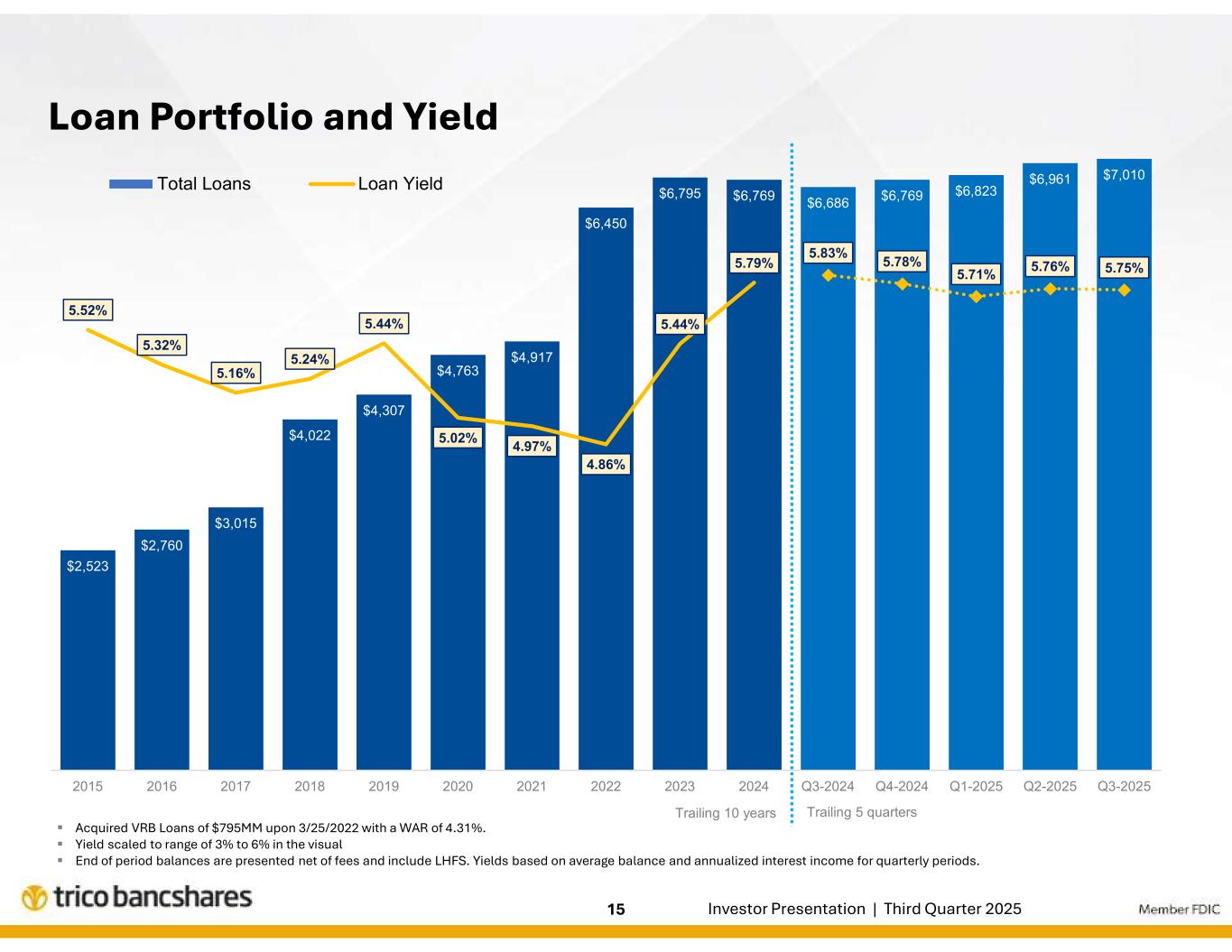 Investor Presentation | Third Quarter 20252 Safe Harbor Statement The statements contained herein that are not historical facts are forward-looking statements based on management’s current expectations and beliefs concerning future developments and their potential effects on us. Such statements involve inherent risks and uncertainties, many of which are difficult to predict and are generally beyond our control. We caution readers that a number of important factors could cause actual results to differ materially from those expressed in, or implied or projected by, such forward-looking statements. These risks and uncertainties include, but are not limited to, the following: macroeconomic, geopolitical, and other challenges and uncertainties, including those related to actual or potential policies and actions from the new U.S. administration, such as tariffs, and reciprocal actions by other countries or regions, significant volatility and disruptions in financial markets, a resurgence of inflation, increases in unemployment rates, increases in interest rates and slowing economic growth or recession in the U.S. and other countries or regions; the impact of any future federal government shutdown and uncertainty regarding the federal government’s debt limit; the impact of changes in financial services industry policies, laws and regulations; regulatory restrictions or adverse regulatory findings affecting our ability to successfully market and price our products to consumers; adverse developments in the financial services industry generally such as bank failures and any related impact on depositor behavior or investor sentiment; the impacts of international hostilities, wars, terrorism or geopolitical events; risks related to the sufficiency of liquidity, including our ability to attract and maintain deposits; the risks related to the development, implementation, use and management of emerging technologies, including artificial intelligence and machine learning; extreme weather, natural disasters and other catastrophic events and their effects on our customers and the economic and business environments in which we operate; current and future economic and market conditions of the local economies in which we conduct operations; declines in housing and commercial real estate prices and changes in the financial performance and/or condition of our borrowers; the market value of our investment securities and possible other-than-temporary impairment of securities held by us due to changes in credit quality or rates; the availability of, and cost of, sources of funding and the demand for our products; the possibility that our recorded goodwill could become impaired, which may have an adverse impact on our earnings and capital; the costs or effects of mergers, acquisitions or dispositions we may make, as well as whether we are able to obtain any required governmental approvals in connection with any such activities, or identify and complete favorable transactions in the future, and/or realize the anticipated financial and business benefits; the volatility of the stock market and its impact on our stock price and our ability to conduct acquisitions; the regulatory and financial impacts associated with exceeding $10 billion in total assets; the ability to execute our business plan in new markets; our future operating or financial performance, including our outlook for future growth; changes in the level and direction of our nonperforming assets and charge-offs and the appropriateness of the allowance for credit losses; the effectiveness of us managing the mix of earning assets and in improving, resolving or liquidating lower-quality assets; changes in accounting standards and practices; changes in consumer spending, borrowing and savings habits; the effects of changes in the level or cost of checking or savings account deposits on our funding costs and net interest margin; increasing noninterest expense and its impact on our financial performance; competition and innovation with respect to financial products and services by banks, financial institutions and non-traditional competitors including retail businesses and technology companies; the challenges of attracting, integrating and retaining key employees; the impact of the 2023 cyber security ransomware incident, including the pending litigation, on our operations and reputation; the vulnerability of our operational or security systems or infrastructure, the systems of third-party vendors or other service providers with whom we contract, and our customers to unauthorized access, computer viruses, phishing schemes, spam attacks, human error, natural disasters, power loss and data/security breaches and the cost to defend against and respond to such incidents; increased data security risks due to work from home arrangements and email vulnerability; failure to safeguard personal information, and any resulting litigation; the effect of a fall in stock market prices on our brokerage and wealth management businesses; the emergence or continuation of widespread health emergencies or pandemics; potential judgments, orders, settlements, penalties, fines and reputational damage resulting from pending or future litigation and regulatory investigations, proceedings and enforcement actions; and our ability to manage the risks involved in the foregoing. There can be no assurance that future developments affecting us will be the same as those anticipated by management. Additional factors that could cause results to differ materially from those described above can be found in our filings with the U.S. Securities and Exchange Commission, including without limitation the “Risk Factors” Section of TriCo’s Annual Report on Form 10-K for the year ended December 31, 2024, Such filings are also available in the “Investor Relations” section of our website, https://www.tcbk.com/investor-relations. Annualized, pro forma, projections and estimates are not forecasts 