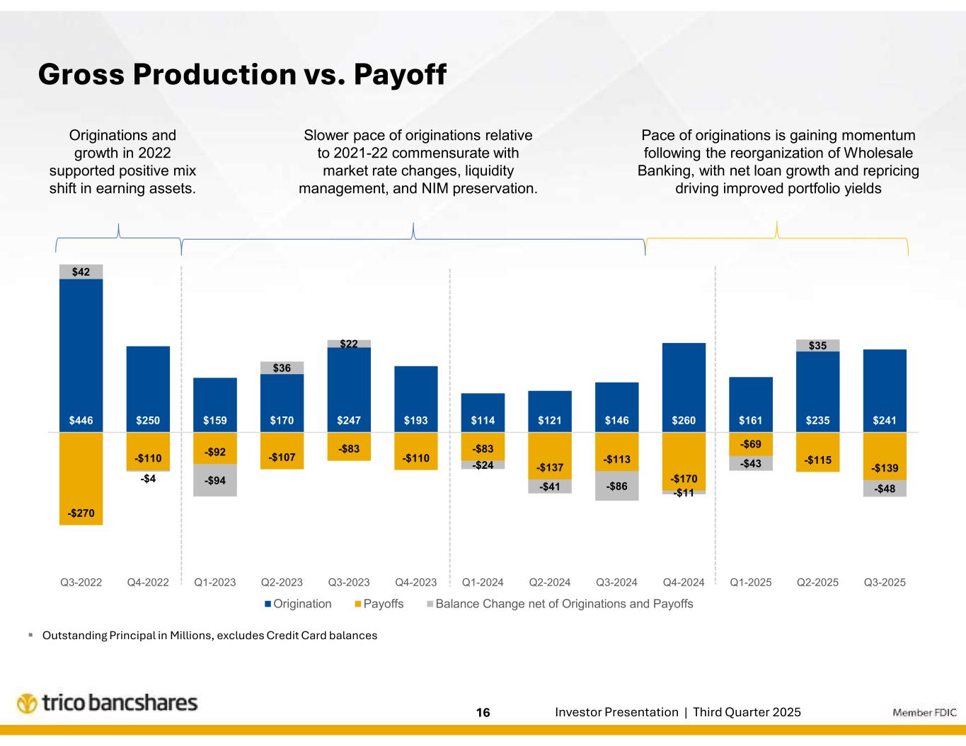 Investor Presentation | Third Quarter 202515 $2,523 $2,760 $3,015 $4,022 $4,307 $4,763 $4,917 $6,450 $6,795 $6,769 $6,686 $6,769 $6,823 $6,961 $7,010 5.52% 5.32% 5.16% 5.24% 5.44% 5.02% 4.97% 4.86% 5.44% 5.79% 5.83% 5.78% 5.71% 5.76% 5.75% 3.00% 4.00% 5.00% 6.00% $0 $1,000 $2,000 $3,000 $4,000 $5,000 $6,000 $7,000 2015 2016 2017 2018 2019 2020 2021 2022 2023 2024 Q3-2024 Q4-2024 Q1-2025 Q2-2025 Q3-2025 Total Loans Loan Yield Loan Portfolio and Yield Trailing 10 years Trailing 5 quarters  Acquired VRB Loans of $795MM upon 3/25/2022 with a WAR of 4.31%.  Yield scaled to range of 3% to 6% in the visual  End of period balances are presented net of fees and include LHFS. Yields based on average balance and annualized interest income for quarterly periods.