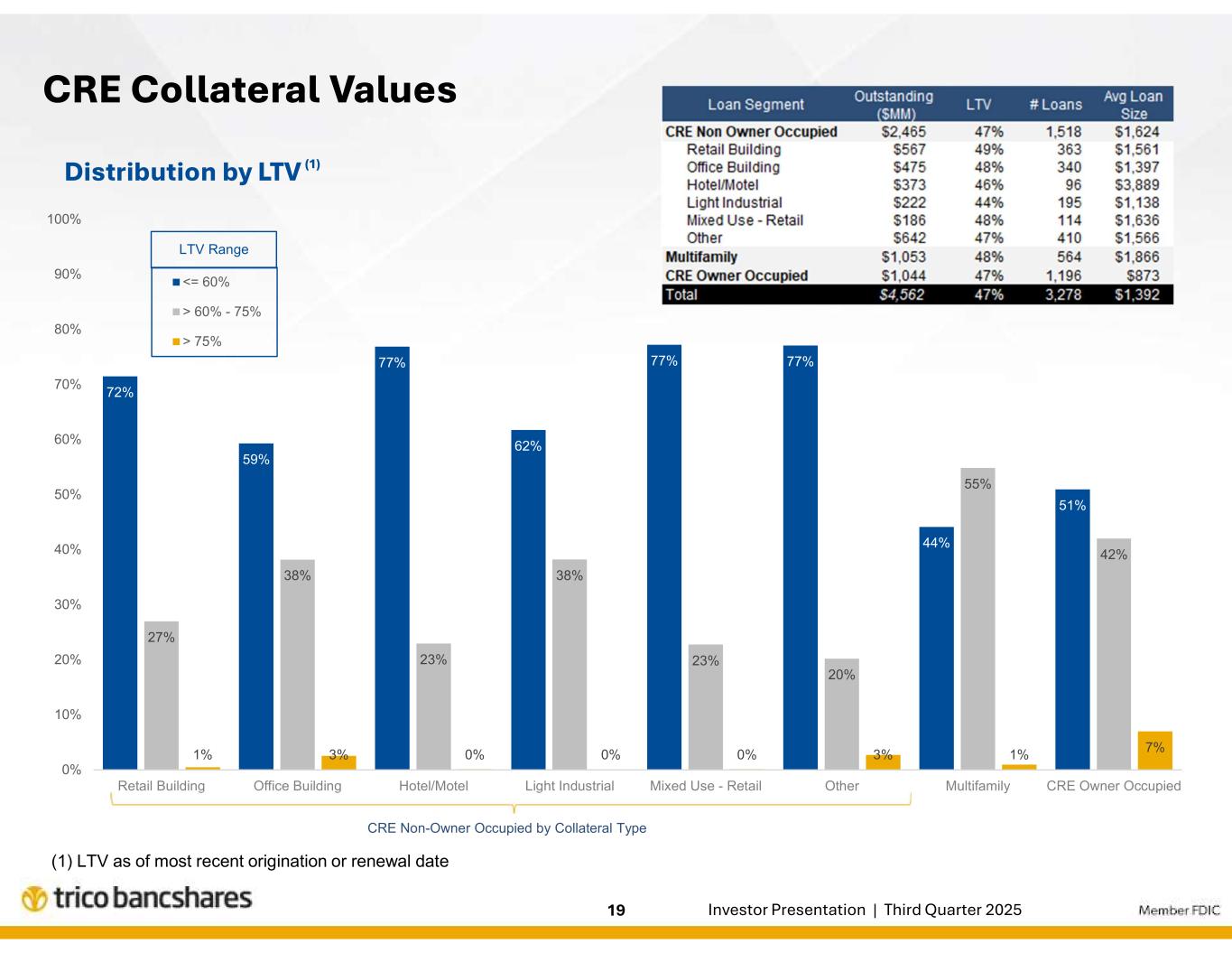 Investor Presentation | Third Quarter 20252 Safe Harbor Statement The statements contained herein that are not historical facts are forward-looking statements based on management’s current expectations and beliefs concerning future developments and their potential effects on us. Such statements involve inherent risks and uncertainties, many of which are difficult to predict and are generally beyond our control. We caution readers that a number of important factors could cause actual results to differ materially from those expressed in, or implied or projected by, such forward-looking statements. These risks and uncertainties include, but are not limited to, the following: macroeconomic, geopolitical, and other challenges and uncertainties, including those related to actual or potential policies and actions from the new U.S. administration, such as tariffs, and reciprocal actions by other countries or regions, significant volatility and disruptions in financial markets, a resurgence of inflation, increases in unemployment rates, increases in interest rates and slowing economic growth or recession in the U.S. and other countries or regions; the impact of any future federal government shutdown and uncertainty regarding the federal government’s debt limit; the impact of changes in financial services industry policies, laws and regulations; regulatory restrictions or adverse regulatory findings affecting our ability to successfully market and price our products to consumers; adverse developments in the financial services industry generally such as bank failures and any related impact on depositor behavior or investor sentiment; the impacts of international hostilities, wars, terrorism or geopolitical events; risks related to the sufficiency of liquidity, including our ability to attract and maintain deposits; the risks related to the development, implementation, use and management of emerging technologies, including artificial intelligence and machine learning; extreme weather, natural disasters and other catastrophic events and their effects on our customers and the economic and business environments in which we operate; current and future economic and market conditions of the local economies in which we conduct operations; declines in housing and commercial real estate prices and changes in the financial performance and/or condition of our borrowers; the market value of our investment securities and possible other-than-temporary impairment of securities held by us due to changes in credit quality or rates; the availability of, and cost of, sources of funding and the demand for our products; the possibility that our recorded goodwill could become impaired, which may have an adverse impact on our earnings and capital; the costs or effects of mergers, acquisitions or dispositions we may make, as well as whether we are able to obtain any required governmental approvals in connection with any such activities, or identify and complete favorable transactions in the future, and/or realize the anticipated financial and business benefits; the volatility of the stock market and its impact on our stock price and our ability to conduct acquisitions; the regulatory and financial impacts associated with exceeding $10 billion in total assets; the ability to execute our business plan in new markets; our future operating or financial performance, including our outlook for future growth; changes in the level and direction of our nonperforming assets and charge-offs and the appropriateness of the allowance for credit losses; the effectiveness of us managing the mix of earning assets and in improving, resolving or liquidating lower-quality assets; changes in accounting standards and practices; changes in consumer spending, borrowing and savings habits; the effects of changes in the level or cost of checking or savings account deposits on our funding costs and net interest margin; increasing noninterest expense and its impact on our financial performance; competition and innovation with respect to financial products and services by banks, financial institutions and non-traditional competitors including retail businesses and technology companies; the challenges of attracting, integrating and retaining key employees; the impact of the 2023 cyber security ransomware incident, including the pending litigation, on our operations and reputation; the vulnerability of our operational or security systems or infrastructure, the systems of third-party vendors or other service providers with whom we contract, and our customers to unauthorized access, computer viruses, phishing schemes, spam attacks, human error, natural disasters, power loss and data/security breaches and the cost to defend against and respond to such incidents; increased data security risks due to work from home arrangements and email vulnerability; failure to safeguard personal information, and any resulting litigation; the effect of a fall in stock market prices on our brokerage and wealth management businesses; the emergence or continuation of widespread health emergencies or pandemics; potential judgments, orders, settlements, penalties, fines and reputational damage resulting from pending or future litigation and regulatory investigations, proceedings and enforcement actions; and our ability to manage the risks involved in the foregoing. There can be no assurance that future developments affecting us will be the same as those anticipated by management. Additional factors that could cause results to differ materially from those described above can be found in our filings with the U.S. Securities and Exchange Commission, including without limitation the “Risk Factors” Section of TriCo’s Annual Report on Form 10-K for the year ended December 31, 2024, Such filings are also available in the “Investor Relations” section of our website, https://www.tcbk.com/investor-relations. Annualized, pro forma, projections and estimates are not forecasts 