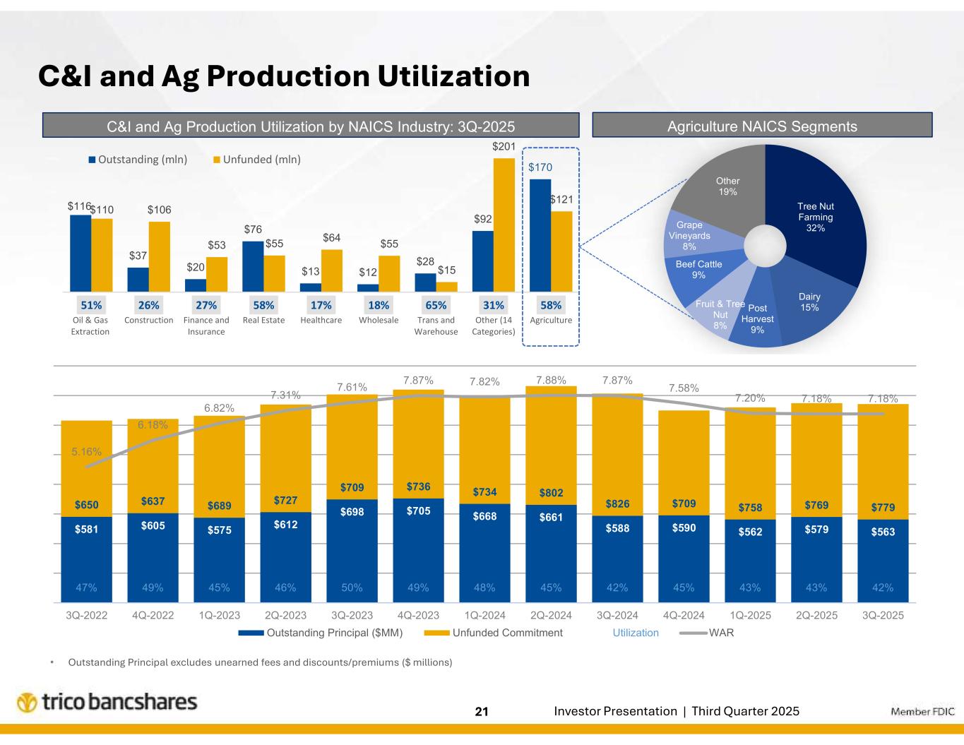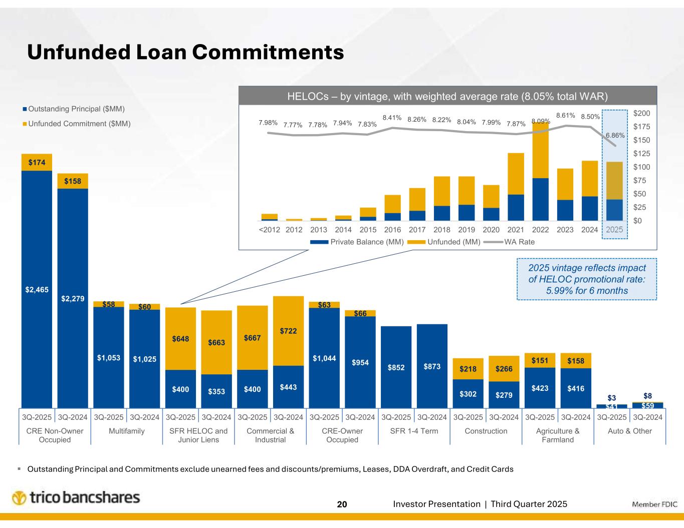 Investor Presentation | Third Quarter 202520 0.00% 0.20% 0.40% 0.60% 0.80% 1.00% $0 $25 $50 $75 $100 $125 $150 $175 $200 20252024202320222021202020192018201720162015201420132012<2012 Private Balance (MM) Unfunded (MM) WA Rate $2,465 $2,279 $1,053 $1,025 $400 $353 $400 $443 $1,044 $954 $852 $873 $302 $279 $423 $416 $41 $59 $174 $158 $58 $60 $648 $663 $667 $722 $63 $66 $218 $266 $151 $158 $3 $8 3Q-2025 3Q-2024 3Q-2025 3Q-2024 3Q-2025 3Q-2024 3Q-2025 3Q-2024 3Q-2025 3Q-2024 3Q-2025 3Q-2024 3Q-2025 3Q-2024 3Q-2025 3Q-2024 3Q-2025 3Q-2024 CRE Non-Owner Occupied Multifamily SFR HELOC and Junior Liens Commercial & Industrial CRE-Owner Occupied SFR 1-4 Term Construction Agriculture & Farmland Auto & Other Outstanding Principal ($MM) Unfunded Commitment ($MM) Unfunded Loan Commitments HELOCs – by vintage, with weighted average rate (8.05% total WAR)  Outstanding Principal and Commitments exclude unearned fees and discounts/premiums, Leases, DDA Overdraft, and Credit Cards 2025 vintage reflects impact of HELOC promotional rate: 5.99% for 6 months 6.86% 8.50%8.61% 8.09%7.87%7.99%8.04%8.22%8.26%8.41% 7.83%7.94%7.78%7.77%7.98%