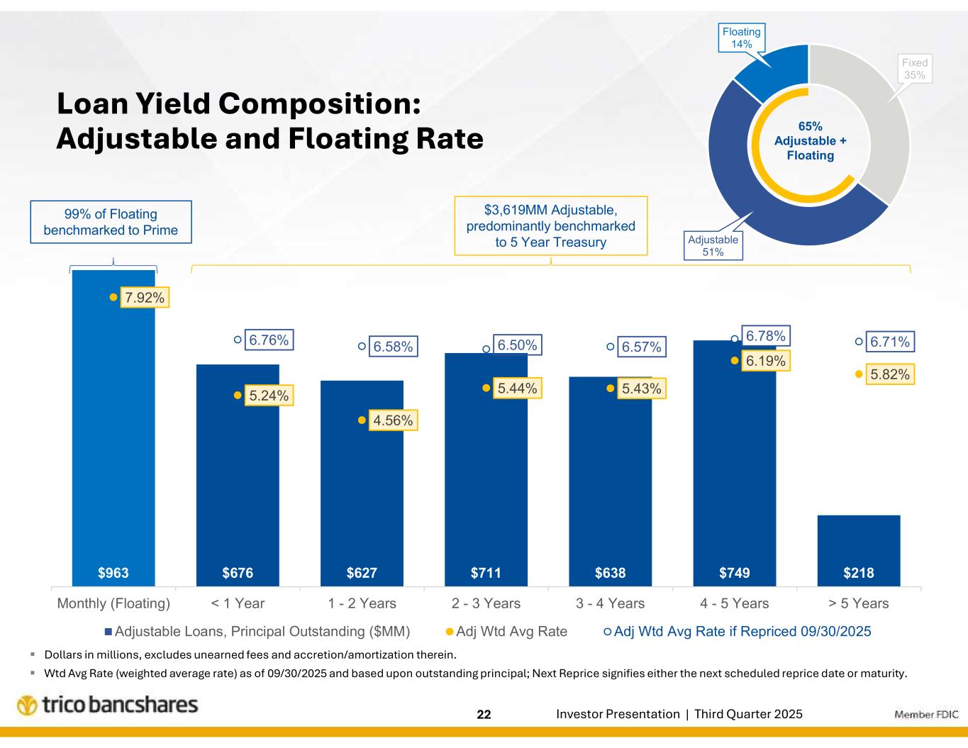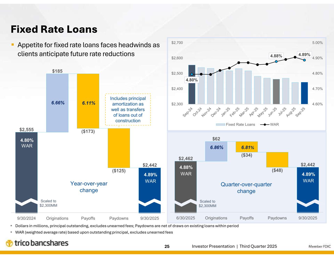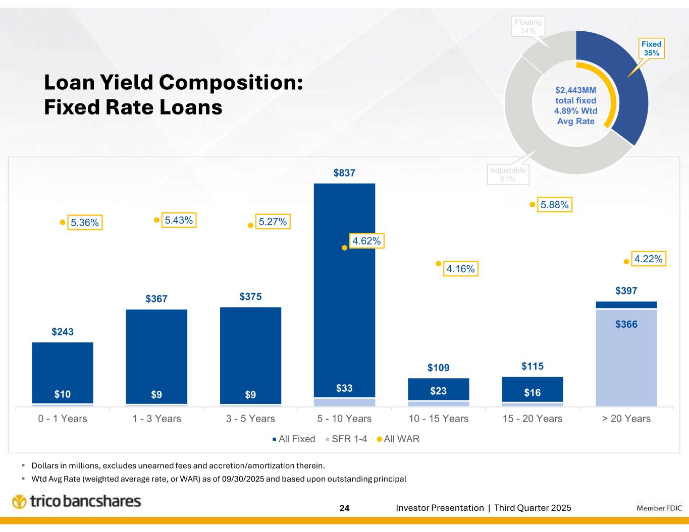 Investor Presentation | Third Quarter 202524 $243 $367 $375 $837 $109 $115 $397 $10 $9 $9 $33 $23 $16 $366 5.36% 5.43% 5.27% 4.62% 4.16% 5.88% 4.22% 0.00% 1.00% 2.00% 3.00% 4.00% 5.00% 6.00% 7.00% $0 $100 $200 $300 $400 $500 $600 $700 $800 $900 0 - 1 Years 1 - 3 Years 3 - 5 Years 5 - 10 Years 10 - 15 Years 15 - 20 Years > 20 Years All Fixed SFR 1-4 All WAR Fixed 35% Adjustable 51% Floating 14% $2,443MM total fixed 4.89% Wtd Avg Rate  Dollars in millions, excludes unearned fees and accretion/amortization therein.  Wtd Avg Rate (weighted average rate, or WAR) as of 09/30/2025 and based upon outstanding principal Loan Yield Composition: Fixed Rate Loans