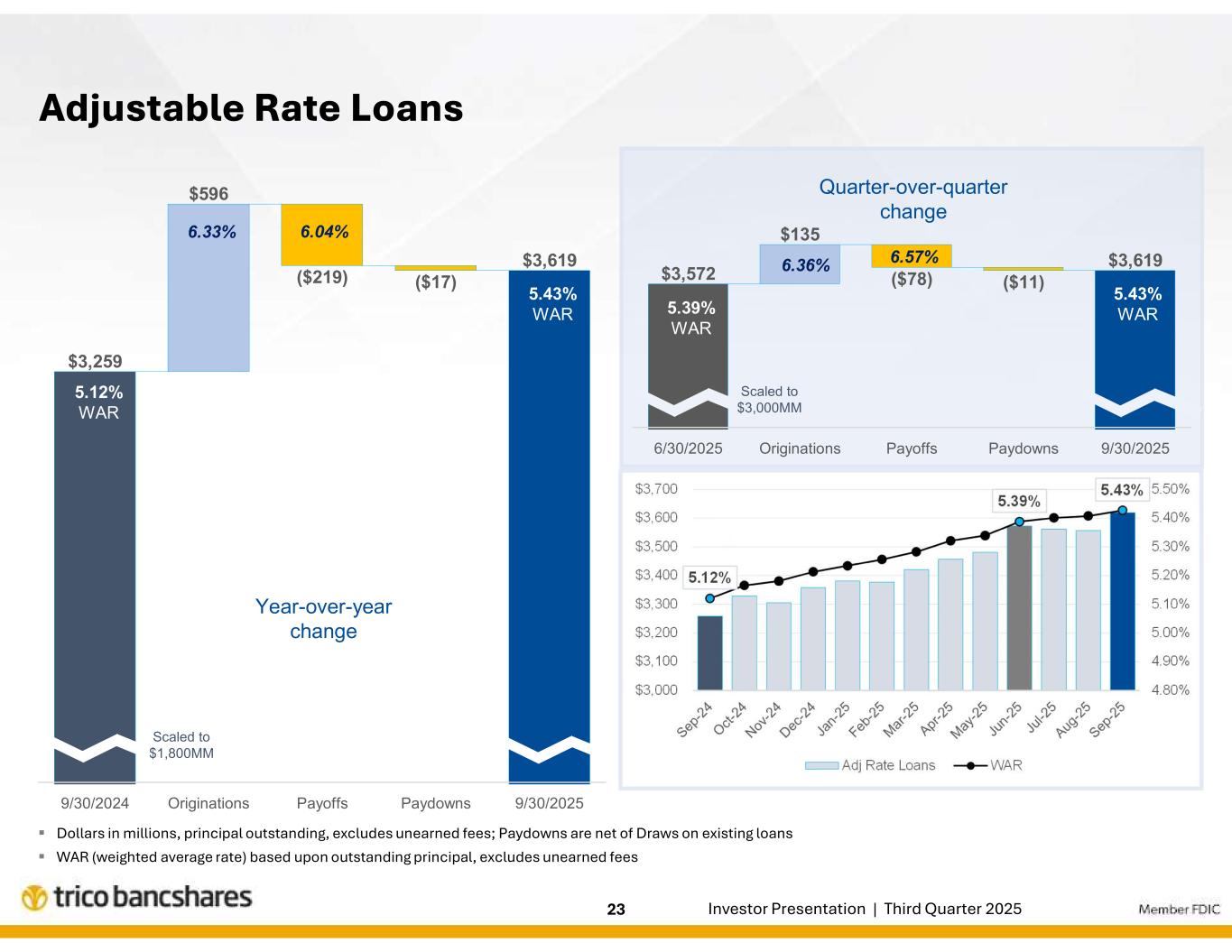 Investor Presentation | Third Quarter 20252 Safe Harbor Statement The statements contained herein that are not historical facts are forward-looking statements based on management’s current expectations and beliefs concerning future developments and their potential effects on us. Such statements involve inherent risks and uncertainties, many of which are difficult to predict and are generally beyond our control. We caution readers that a number of important factors could cause actual results to differ materially from those expressed in, or implied or projected by, such forward-looking statements. These risks and uncertainties include, but are not limited to, the following: macroeconomic, geopolitical, and other challenges and uncertainties, including those related to actual or potential policies and actions from the new U.S. administration, such as tariffs, and reciprocal actions by other countries or regions, significant volatility and disruptions in financial markets, a resurgence of inflation, increases in unemployment rates, increases in interest rates and slowing economic growth or recession in the U.S. and other countries or regions; the impact of any future federal government shutdown and uncertainty regarding the federal government’s debt limit; the impact of changes in financial services industry policies, laws and regulations; regulatory restrictions or adverse regulatory findings affecting our ability to successfully market and price our products to consumers; adverse developments in the financial services industry generally such as bank failures and any related impact on depositor behavior or investor sentiment; the impacts of international hostilities, wars, terrorism or geopolitical events; risks related to the sufficiency of liquidity, including our ability to attract and maintain deposits; the risks related to the development, implementation, use and management of emerging technologies, including artificial intelligence and machine learning; extreme weather, natural disasters and other catastrophic events and their effects on our customers and the economic and business environments in which we operate; current and future economic and market conditions of the local economies in which we conduct operations; declines in housing and commercial real estate prices and changes in the financial performance and/or condition of our borrowers; the market value of our investment securities and possible other-than-temporary impairment of securities held by us due to changes in credit quality or rates; the availability of, and cost of, sources of funding and the demand for our products; the possibility that our recorded goodwill could become impaired, which may have an adverse impact on our earnings and capital; the costs or effects of mergers, acquisitions or dispositions we may make, as well as whether we are able to obtain any required governmental approvals in connection with any such activities, or identify and complete favorable transactions in the future, and/or realize the anticipated financial and business benefits; the volatility of the stock market and its impact on our stock price and our ability to conduct acquisitions; the regulatory and financial impacts associated with exceeding $10 billion in total assets; the ability to execute our business plan in new markets; our future operating or financial performance, including our outlook for future growth; changes in the level and direction of our nonperforming assets and charge-offs and the appropriateness of the allowance for credit losses; the effectiveness of us managing the mix of earning assets and in improving, resolving or liquidating lower-quality assets; changes in accounting standards and practices; changes in consumer spending, borrowing and savings habits; the effects of changes in the level or cost of checking or savings account deposits on our funding costs and net interest margin; increasing noninterest expense and its impact on our financial performance; competition and innovation with respect to financial products and services by banks, financial institutions and non-traditional competitors including retail businesses and technology companies; the challenges of attracting, integrating and retaining key employees; the impact of the 2023 cyber security ransomware incident, including the pending litigation, on our operations and reputation; the vulnerability of our operational or security systems or infrastructure, the systems of third-party vendors or other service providers with whom we contract, and our customers to unauthorized access, computer viruses, phishing schemes, spam attacks, human error, natural disasters, power loss and data/security breaches and the cost to defend against and respond to such incidents; increased data security risks due to work from home arrangements and email vulnerability; failure to safeguard personal information, and any resulting litigation; the effect of a fall in stock market prices on our brokerage and wealth management businesses; the emergence or continuation of widespread health emergencies or pandemics; potential judgments, orders, settlements, penalties, fines and reputational damage resulting from pending or future litigation and regulatory investigations, proceedings and enforcement actions; and our ability to manage the risks involved in the foregoing. There can be no assurance that future developments affecting us will be the same as those anticipated by management. Additional factors that could cause results to differ materially from those described above can be found in our filings with the U.S. Securities and Exchange Commission, including without limitation the “Risk Factors” Section of TriCo’s Annual Report on Form 10-K for the year ended December 31, 2024, Such filings are also available in the “Investor Relations” section of our website, https://www.tcbk.com/investor-relations. Annualized, pro forma, projections and estimates are not forecasts 