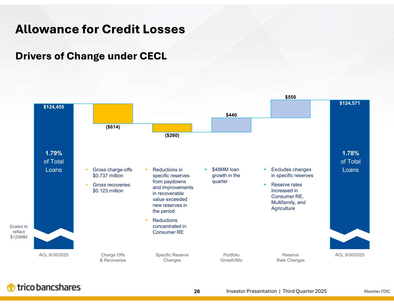 Investor Presentation | Third Quarter 20252 Safe Harbor Statement The statements contained herein that are not historical facts are forward-looking statements based on management’s current expectations and beliefs concerning future developments and their potential effects on us. Such statements involve inherent risks and uncertainties, many of which are difficult to predict and are generally beyond our control. We caution readers that a number of important factors could cause actual results to differ materially from those expressed in, or implied or projected by, such forward-looking statements. These risks and uncertainties include, but are not limited to, the following: macroeconomic, geopolitical, and other challenges and uncertainties, including those related to actual or potential policies and actions from the new U.S. administration, such as tariffs, and reciprocal actions by other countries or regions, significant volatility and disruptions in financial markets, a resurgence of inflation, increases in unemployment rates, increases in interest rates and slowing economic growth or recession in the U.S. and other countries or regions; the impact of any future federal government shutdown and uncertainty regarding the federal government’s debt limit; the impact of changes in financial services industry policies, laws and regulations; regulatory restrictions or adverse regulatory findings affecting our ability to successfully market and price our products to consumers; adverse developments in the financial services industry generally such as bank failures and any related impact on depositor behavior or investor sentiment; the impacts of international hostilities, wars, terrorism or geopolitical events; risks related to the sufficiency of liquidity, including our ability to attract and maintain deposits; the risks related to the development, implementation, use and management of emerging technologies, including artificial intelligence and machine learning; extreme weather, natural disasters and other catastrophic events and their effects on our customers and the economic and business environments in which we operate; current and future economic and market conditions of the local economies in which we conduct operations; declines in housing and commercial real estate prices and changes in the financial performance and/or condition of our borrowers; the market value of our investment securities and possible other-than-temporary impairment of securities held by us due to changes in credit quality or rates; the availability of, and cost of, sources of funding and the demand for our products; the possibility that our recorded goodwill could become impaired, which may have an adverse impact on our earnings and capital; the costs or effects of mergers, acquisitions or dispositions we may make, as well as whether we are able to obtain any required governmental approvals in connection with any such activities, or identify and complete favorable transactions in the future, and/or realize the anticipated financial and business benefits; the volatility of the stock market and its impact on our stock price and our ability to conduct acquisitions; the regulatory and financial impacts associated with exceeding $10 billion in total assets; the ability to execute our business plan in new markets; our future operating or financial performance, including our outlook for future growth; changes in the level and direction of our nonperforming assets and charge-offs and the appropriateness of the allowance for credit losses; the effectiveness of us managing the mix of earning assets and in improving, resolving or liquidating lower-quality assets; changes in accounting standards and practices; changes in consumer spending, borrowing and savings habits; the effects of changes in the level or cost of checking or savings account deposits on our funding costs and net interest margin; increasing noninterest expense and its impact on our financial performance; competition and innovation with respect to financial products and services by banks, financial institutions and non-traditional competitors including retail businesses and technology companies; the challenges of attracting, integrating and retaining key employees; the impact of the 2023 cyber security ransomware incident, including the pending litigation, on our operations and reputation; the vulnerability of our operational or security systems or infrastructure, the systems of third-party vendors or other service providers with whom we contract, and our customers to unauthorized access, computer viruses, phishing schemes, spam attacks, human error, natural disasters, power loss and data/security breaches and the cost to defend against and respond to such incidents; increased data security risks due to work from home arrangements and email vulnerability; failure to safeguard personal information, and any resulting litigation; the effect of a fall in stock market prices on our brokerage and wealth management businesses; the emergence or continuation of widespread health emergencies or pandemics; potential judgments, orders, settlements, penalties, fines and reputational damage resulting from pending or future litigation and regulatory investigations, proceedings and enforcement actions; and our ability to manage the risks involved in the foregoing. There can be no assurance that future developments affecting us will be the same as those anticipated by management. Additional factors that could cause results to differ materially from those described above can be found in our filings with the U.S. Securities and Exchange Commission, including without limitation the “Risk Factors” Section of TriCo’s Annual Report on Form 10-K for the year ended December 31, 2024, Such filings are also available in the “Investor Relations” section of our website, https://www.tcbk.com/investor-relations. Annualized, pro forma, projections and estimates are not forecasts 