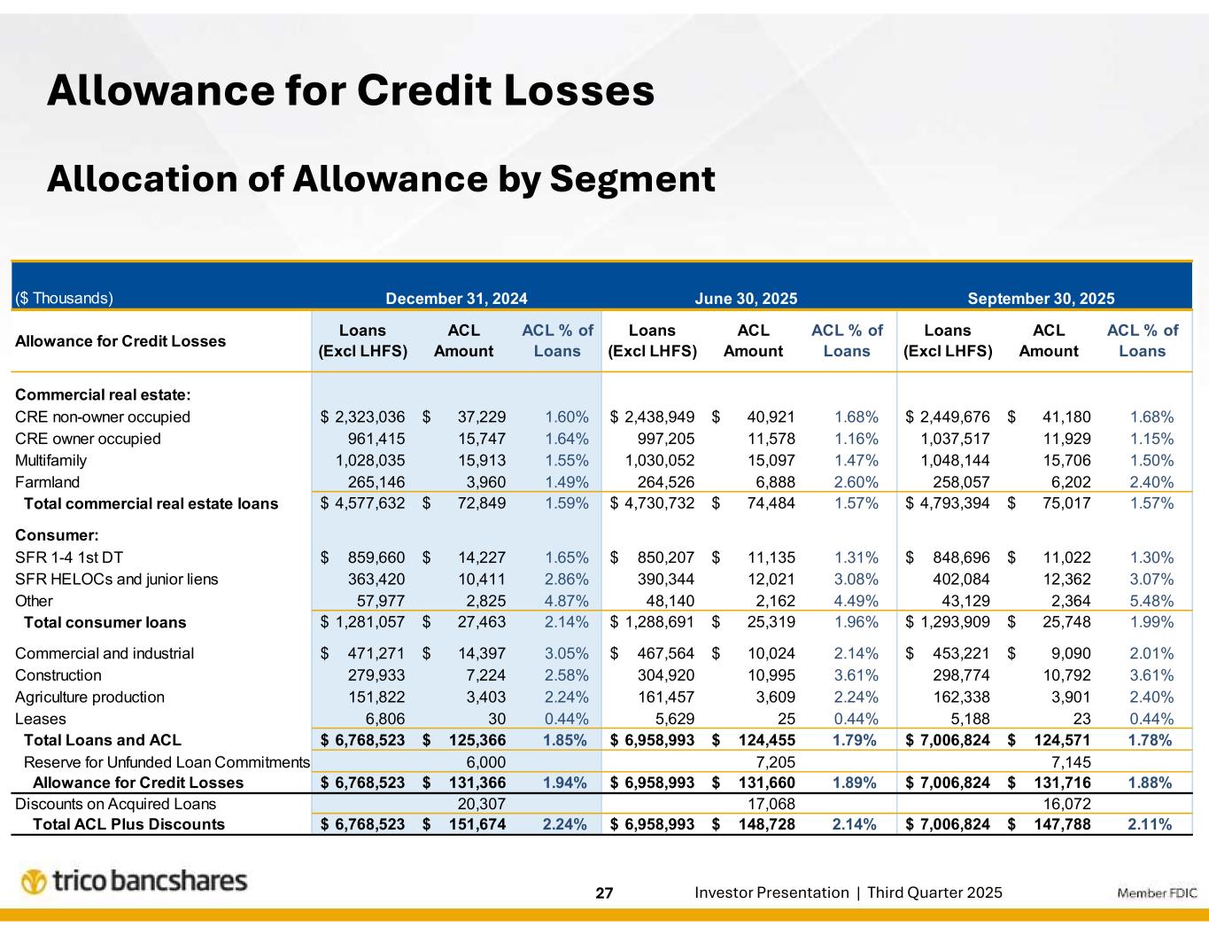 Investor Presentation | Third Quarter 202526 ($614) ($260) $440 $550 $124,455 $124,571 ACL 6/30/2025 Charge Offs & Recoveries Specific Reserve Changes Portfolio Growth/Mix Reserve Rate Changes ACL 9/30/2025 $120,000 $120,500 $121,000 $121,500 $122,000 $122,500 $123,000 $123,500 $124,000 $124,500 $125,000 $125,500 Allowance for Credit Losses Drivers of Change under CECL  Reductions in specific reserves from paydowns and improvements in recoverable value exceeded new reserves in the period  Reductions concentrated in Consumer RE  Excludes changes in specific reserves  Reserve rates increased in Consumer RE, Multifamily, and Agriculture  Gross charge-offs $0.737 million  Gross recoveries $0.123 million 1.79% of Total Loans 1.78% of Total Loans $48MM loan growth in the quarter Scaled to reflect $120MM