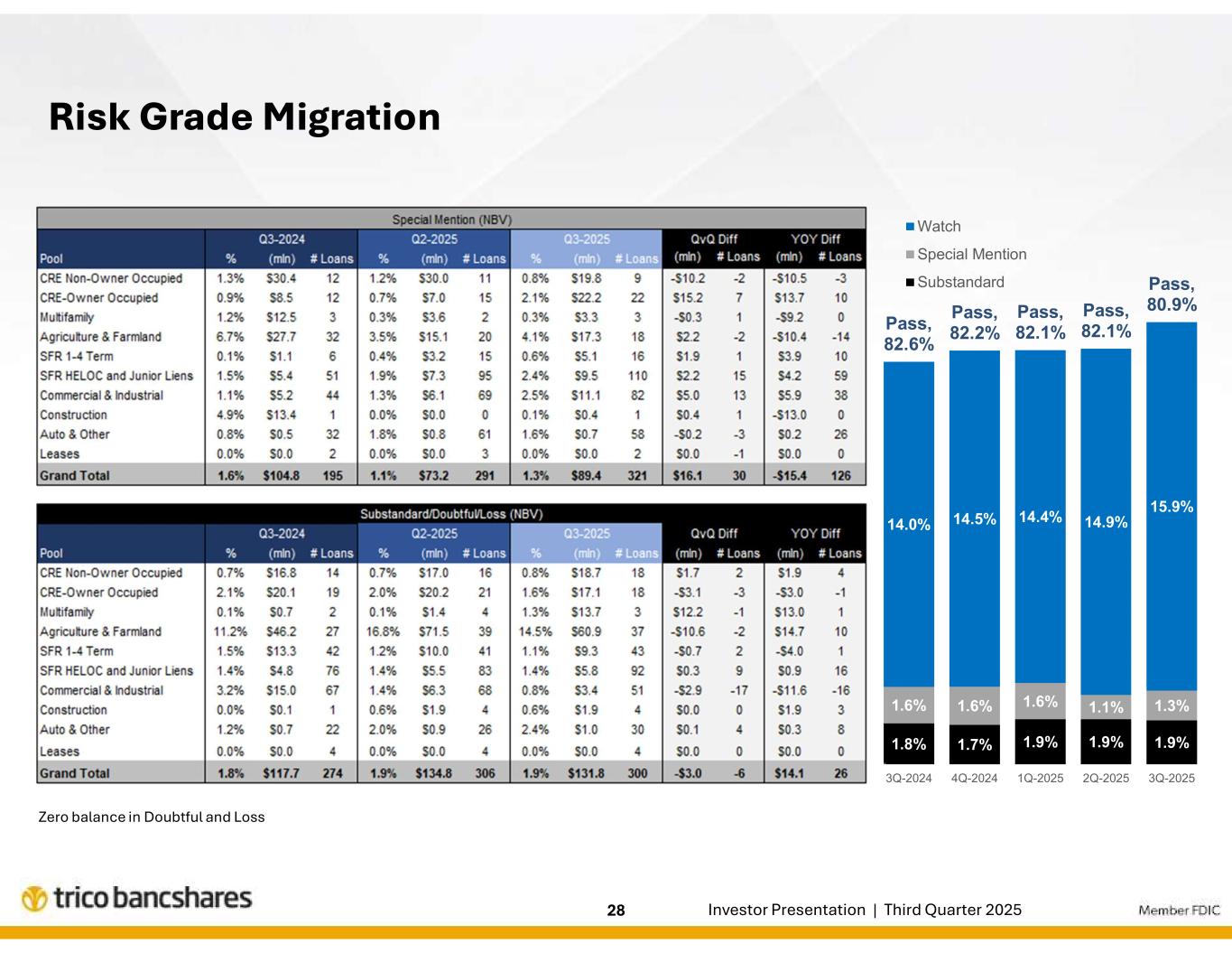 Investor Presentation | Third Quarter 202528 1.9%1.9%1.9%1.7%1.8% 1.3%1.1%1.6%1.6%1.6% 15.9% 14.9%14.4%14.5%14.0% Pass, 80.9%Pass, 82.1% Pass, 82.1% Pass, 82.2%Pass, 82.6% 0.0% 20.0% 3Q-20252Q-20251Q-20254Q-20243Q-2024 Watch Special Mention Substandard Risk Grade Migration Zero balance in Doubtful and Loss