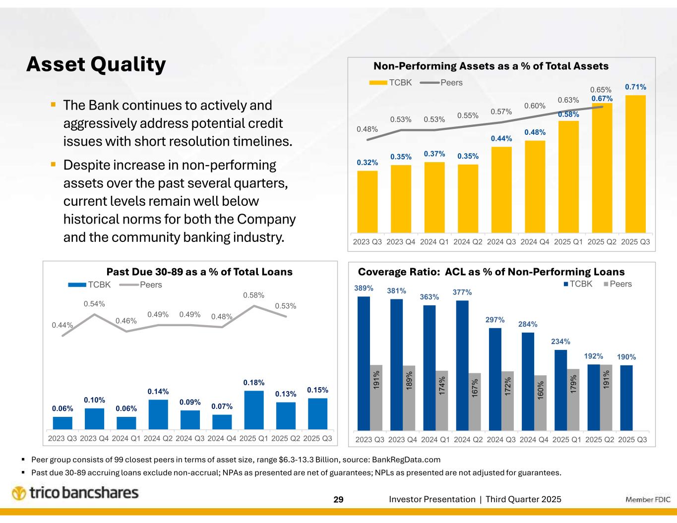 Investor Presentation | Third Quarter 20252 Safe Harbor Statement The statements contained herein that are not historical facts are forward-looking statements based on management’s current expectations and beliefs concerning future developments and their potential effects on us. Such statements involve inherent risks and uncertainties, many of which are difficult to predict and are generally beyond our control. We caution readers that a number of important factors could cause actual results to differ materially from those expressed in, or implied or projected by, such forward-looking statements. These risks and uncertainties include, but are not limited to, the following: macroeconomic, geopolitical, and other challenges and uncertainties, including those related to actual or potential policies and actions from the new U.S. administration, such as tariffs, and reciprocal actions by other countries or regions, significant volatility and disruptions in financial markets, a resurgence of inflation, increases in unemployment rates, increases in interest rates and slowing economic growth or recession in the U.S. and other countries or regions; the impact of any future federal government shutdown and uncertainty regarding the federal government’s debt limit; the impact of changes in financial services industry policies, laws and regulations; regulatory restrictions or adverse regulatory findings affecting our ability to successfully market and price our products to consumers; adverse developments in the financial services industry generally such as bank failures and any related impact on depositor behavior or investor sentiment; the impacts of international hostilities, wars, terrorism or geopolitical events; risks related to the sufficiency of liquidity, including our ability to attract and maintain deposits; the risks related to the development, implementation, use and management of emerging technologies, including artificial intelligence and machine learning; extreme weather, natural disasters and other catastrophic events and their effects on our customers and the economic and business environments in which we operate; current and future economic and market conditions of the local economies in which we conduct operations; declines in housing and commercial real estate prices and changes in the financial performance and/or condition of our borrowers; the market value of our investment securities and possible other-than-temporary impairment of securities held by us due to changes in credit quality or rates; the availability of, and cost of, sources of funding and the demand for our products; the possibility that our recorded goodwill could become impaired, which may have an adverse impact on our earnings and capital; the costs or effects of mergers, acquisitions or dispositions we may make, as well as whether we are able to obtain any required governmental approvals in connection with any such activities, or identify and complete favorable transactions in the future, and/or realize the anticipated financial and business benefits; the volatility of the stock market and its impact on our stock price and our ability to conduct acquisitions; the regulatory and financial impacts associated with exceeding $10 billion in total assets; the ability to execute our business plan in new markets; our future operating or financial performance, including our outlook for future growth; changes in the level and direction of our nonperforming assets and charge-offs and the appropriateness of the allowance for credit losses; the effectiveness of us managing the mix of earning assets and in improving, resolving or liquidating lower-quality assets; changes in accounting standards and practices; changes in consumer spending, borrowing and savings habits; the effects of changes in the level or cost of checking or savings account deposits on our funding costs and net interest margin; increasing noninterest expense and its impact on our financial performance; competition and innovation with respect to financial products and services by banks, financial institutions and non-traditional competitors including retail businesses and technology companies; the challenges of attracting, integrating and retaining key employees; the impact of the 2023 cyber security ransomware incident, including the pending litigation, on our operations and reputation; the vulnerability of our operational or security systems or infrastructure, the systems of third-party vendors or other service providers with whom we contract, and our customers to unauthorized access, computer viruses, phishing schemes, spam attacks, human error, natural disasters, power loss and data/security breaches and the cost to defend against and respond to such incidents; increased data security risks due to work from home arrangements and email vulnerability; failure to safeguard personal information, and any resulting litigation; the effect of a fall in stock market prices on our brokerage and wealth management businesses; the emergence or continuation of widespread health emergencies or pandemics; potential judgments, orders, settlements, penalties, fines and reputational damage resulting from pending or future litigation and regulatory investigations, proceedings and enforcement actions; and our ability to manage the risks involved in the foregoing. There can be no assurance that future developments affecting us will be the same as those anticipated by management. Additional factors that could cause results to differ materially from those described above can be found in our filings with the U.S. Securities and Exchange Commission, including without limitation the “Risk Factors” Section of TriCo’s Annual Report on Form 10-K for the year ended December 31, 2024, Such filings are also available in the “Investor Relations” section of our website, https://www.tcbk.com/investor-relations. Annualized, pro forma, projections and estimates are not forecasts 