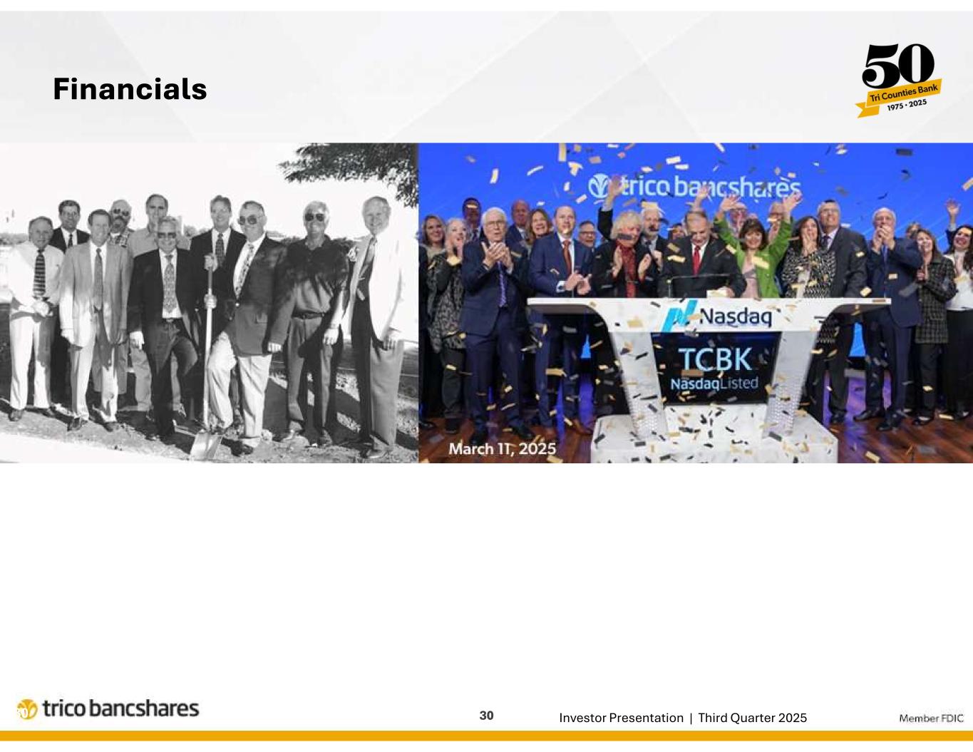 Investor Presentation | Third Quarter 20252 Safe Harbor Statement The statements contained herein that are not historical facts are forward-looking statements based on management’s current expectations and beliefs concerning future developments and their potential effects on us. Such statements involve inherent risks and uncertainties, many of which are difficult to predict and are generally beyond our control. We caution readers that a number of important factors could cause actual results to differ materially from those expressed in, or implied or projected by, such forward-looking statements. These risks and uncertainties include, but are not limited to, the following: macroeconomic, geopolitical, and other challenges and uncertainties, including those related to actual or potential policies and actions from the new U.S. administration, such as tariffs, and reciprocal actions by other countries or regions, significant volatility and disruptions in financial markets, a resurgence of inflation, increases in unemployment rates, increases in interest rates and slowing economic growth or recession in the U.S. and other countries or regions; the impact of any future federal government shutdown and uncertainty regarding the federal government’s debt limit; the impact of changes in financial services industry policies, laws and regulations; regulatory restrictions or adverse regulatory findings affecting our ability to successfully market and price our products to consumers; adverse developments in the financial services industry generally such as bank failures and any related impact on depositor behavior or investor sentiment; the impacts of international hostilities, wars, terrorism or geopolitical events; risks related to the sufficiency of liquidity, including our ability to attract and maintain deposits; the risks related to the development, implementation, use and management of emerging technologies, including artificial intelligence and machine learning; extreme weather, natural disasters and other catastrophic events and their effects on our customers and the economic and business environments in which we operate; current and future economic and market conditions of the local economies in which we conduct operations; declines in housing and commercial real estate prices and changes in the financial performance and/or condition of our borrowers; the market value of our investment securities and possible other-than-temporary impairment of securities held by us due to changes in credit quality or rates; the availability of, and cost of, sources of funding and the demand for our products; the possibility that our recorded goodwill could become impaired, which may have an adverse impact on our earnings and capital; the costs or effects of mergers, acquisitions or dispositions we may make, as well as whether we are able to obtain any required governmental approvals in connection with any such activities, or identify and complete favorable transactions in the future, and/or realize the anticipated financial and business benefits; the volatility of the stock market and its impact on our stock price and our ability to conduct acquisitions; the regulatory and financial impacts associated with exceeding $10 billion in total assets; the ability to execute our business plan in new markets; our future operating or financial performance, including our outlook for future growth; changes in the level and direction of our nonperforming assets and charge-offs and the appropriateness of the allowance for credit losses; the effectiveness of us managing the mix of earning assets and in improving, resolving or liquidating lower-quality assets; changes in accounting standards and practices; changes in consumer spending, borrowing and savings habits; the effects of changes in the level or cost of checking or savings account deposits on our funding costs and net interest margin; increasing noninterest expense and its impact on our financial performance; competition and innovation with respect to financial products and services by banks, financial institutions and non-traditional competitors including retail businesses and technology companies; the challenges of attracting, integrating and retaining key employees; the impact of the 2023 cyber security ransomware incident, including the pending litigation, on our operations and reputation; the vulnerability of our operational or security systems or infrastructure, the systems of third-party vendors or other service providers with whom we contract, and our customers to unauthorized access, computer viruses, phishing schemes, spam attacks, human error, natural disasters, power loss and data/security breaches and the cost to defend against and respond to such incidents; increased data security risks due to work from home arrangements and email vulnerability; failure to safeguard personal information, and any resulting litigation; the effect of a fall in stock market prices on our brokerage and wealth management businesses; the emergence or continuation of widespread health emergencies or pandemics; potential judgments, orders, settlements, penalties, fines and reputational damage resulting from pending or future litigation and regulatory investigations, proceedings and enforcement actions; and our ability to manage the risks involved in the foregoing. There can be no assurance that future developments affecting us will be the same as those anticipated by management. Additional factors that could cause results to differ materially from those described above can be found in our filings with the U.S. Securities and Exchange Commission, including without limitation the “Risk Factors” Section of TriCo’s Annual Report on Form 10-K for the year ended December 31, 2024, Such filings are also available in the “Investor Relations” section of our website, https://www.tcbk.com/investor-relations. Annualized, pro forma, projections and estimates are not forecasts 