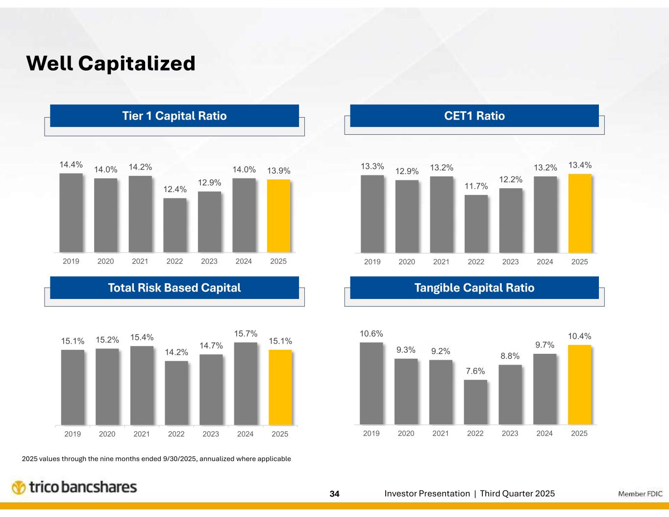 Investor Presentation | Third Quarter 20252 Safe Harbor Statement The statements contained herein that are not historical facts are forward-looking statements based on management’s current expectations and beliefs concerning future developments and their potential effects on us. Such statements involve inherent risks and uncertainties, many of which are difficult to predict and are generally beyond our control. We caution readers that a number of important factors could cause actual results to differ materially from those expressed in, or implied or projected by, such forward-looking statements. These risks and uncertainties include, but are not limited to, the following: macroeconomic, geopolitical, and other challenges and uncertainties, including those related to actual or potential policies and actions from the new U.S. administration, such as tariffs, and reciprocal actions by other countries or regions, significant volatility and disruptions in financial markets, a resurgence of inflation, increases in unemployment rates, increases in interest rates and slowing economic growth or recession in the U.S. and other countries or regions; the impact of any future federal government shutdown and uncertainty regarding the federal government’s debt limit; the impact of changes in financial services industry policies, laws and regulations; regulatory restrictions or adverse regulatory findings affecting our ability to successfully market and price our products to consumers; adverse developments in the financial services industry generally such as bank failures and any related impact on depositor behavior or investor sentiment; the impacts of international hostilities, wars, terrorism or geopolitical events; risks related to the sufficiency of liquidity, including our ability to attract and maintain deposits; the risks related to the development, implementation, use and management of emerging technologies, including artificial intelligence and machine learning; extreme weather, natural disasters and other catastrophic events and their effects on our customers and the economic and business environments in which we operate; current and future economic and market conditions of the local economies in which we conduct operations; declines in housing and commercial real estate prices and changes in the financial performance and/or condition of our borrowers; the market value of our investment securities and possible other-than-temporary impairment of securities held by us due to changes in credit quality or rates; the availability of, and cost of, sources of funding and the demand for our products; the possibility that our recorded goodwill could become impaired, which may have an adverse impact on our earnings and capital; the costs or effects of mergers, acquisitions or dispositions we may make, as well as whether we are able to obtain any required governmental approvals in connection with any such activities, or identify and complete favorable transactions in the future, and/or realize the anticipated financial and business benefits; the volatility of the stock market and its impact on our stock price and our ability to conduct acquisitions; the regulatory and financial impacts associated with exceeding $10 billion in total assets; the ability to execute our business plan in new markets; our future operating or financial performance, including our outlook for future growth; changes in the level and direction of our nonperforming assets and charge-offs and the appropriateness of the allowance for credit losses; the effectiveness of us managing the mix of earning assets and in improving, resolving or liquidating lower-quality assets; changes in accounting standards and practices; changes in consumer spending, borrowing and savings habits; the effects of changes in the level or cost of checking or savings account deposits on our funding costs and net interest margin; increasing noninterest expense and its impact on our financial performance; competition and innovation with respect to financial products and services by banks, financial institutions and non-traditional competitors including retail businesses and technology companies; the challenges of attracting, integrating and retaining key employees; the impact of the 2023 cyber security ransomware incident, including the pending litigation, on our operations and reputation; the vulnerability of our operational or security systems or infrastructure, the systems of third-party vendors or other service providers with whom we contract, and our customers to unauthorized access, computer viruses, phishing schemes, spam attacks, human error, natural disasters, power loss and data/security breaches and the cost to defend against and respond to such incidents; increased data security risks due to work from home arrangements and email vulnerability; failure to safeguard personal information, and any resulting litigation; the effect of a fall in stock market prices on our brokerage and wealth management businesses; the emergence or continuation of widespread health emergencies or pandemics; potential judgments, orders, settlements, penalties, fines and reputational damage resulting from pending or future litigation and regulatory investigations, proceedings and enforcement actions; and our ability to manage the risks involved in the foregoing. There can be no assurance that future developments affecting us will be the same as those anticipated by management. Additional factors that could cause results to differ materially from those described above can be found in our filings with the U.S. Securities and Exchange Commission, including without limitation the “Risk Factors” Section of TriCo’s Annual Report on Form 10-K for the year ended December 31, 2024, Such filings are also available in the “Investor Relations” section of our website, https://www.tcbk.com/investor-relations. Annualized, pro forma, projections and estimates are not forecasts 
