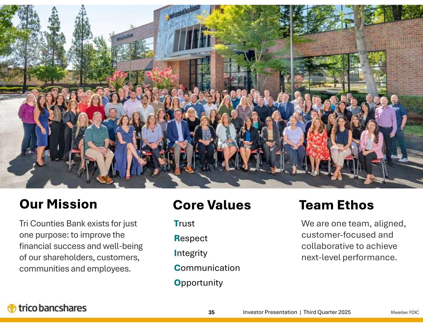 Investor Presentation | Third Quarter 202535 Our Mission Tri Counties Bank exists for just one purpose: to improve the financial success and well-being of our shareholders, customers, communities and employees. Core Values Trust Respect Integrity Communication Opportunity Team Ethos We are one team, aligned, customer-focused and collaborative to achieve next-level performance.