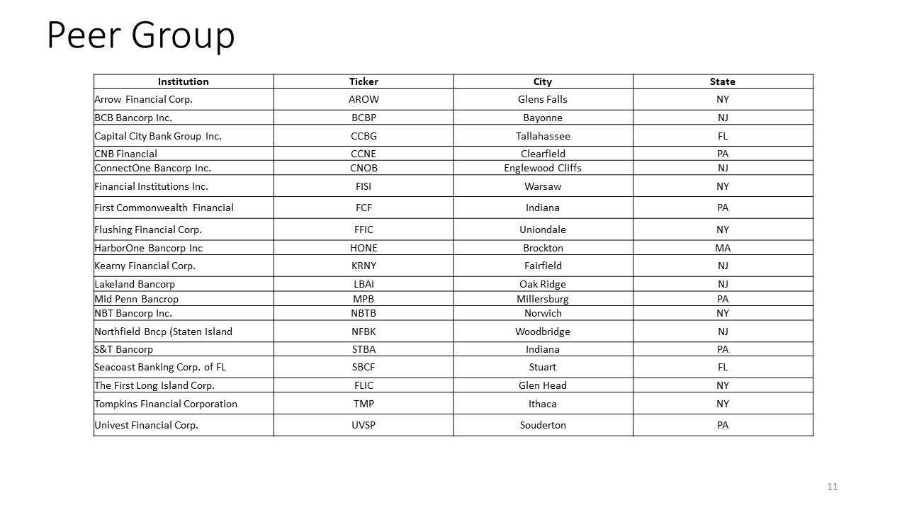 11  Peer Group  Institution  Ticker  City  State  Arrow Financial Corp.  AROW  Glens Falls  NY  BCB Bancorp Inc.  BCBP  Bayonne  NJ  Capital City Bank Group Inc.  CCBG  Tallahassee  FL  CNB Financial  CCNE  Clearfield  PA  ConnectOne Bancorp Inc.  CNOB  Englewood Cliffs  NJ  Financial Institutions Inc.  FISI  Warsaw  NY  First Commonwealth Financial  FCF  Indiana  PA  Flushing Financial Corp.  FFIC  Uniondale  NY  HarborOne Bancorp Inc  HONE  Brockton  MA  Kearny Financial Corp.  KRNY  Fairfield  NJ  Lakeland Bancorp  LBAI  Oak Ridge  NJ  Mid Penn Bancrop  MPB  Millersburg  PA  NBT Bancorp Inc.  NBTB  Norwich  NY  Northfield Bncp (Staten Island  NFBK  Woodbridge  NJ  S&T Bancorp  STBA  Indiana  PA  Seacoast Banking Corp. of FL  SBCF  Stuart  FL  The First Long Island Corp.  FLIC  Glen Head  NY  Tompkins Financial Corporation  TMP  Ithaca  NY  Univest Financial Corp.  UVSP  Souderton  PA