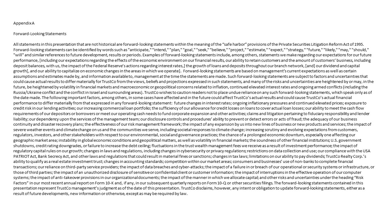 Appendix A     Forward-Looking Statements     All statements in this presentation that are not historical are forward-looking statements within the meaning of the “safe harbor” provisions of the Private Securities Litigation Reform Act of 1995. Forward-looking statements can be identified by words such as "anticipate," "intend," "plan," "goal," "seek," "believe," "project," "estimate," "expect," "strategy," "future," "likely," "may," "should," "will" and similar references to future development, results or periods. Examples of forward-looking statements include, among others, statements we make regarding our expectations for our future performance, [including our expectations regarding the effects of the economic environment on our financial results, our ability to retain customers and the amount of customers’ business, including deposit balances, with us, the impact of the Federal Reserve’s actions regarding interest rates,] the growth of loans and deposits throughout our branch network, [and] our dividend and capital growth[, and our ability to capitalize on economic changes in the areas in which we operate]. Forward-looking statements are based on management’s current expectations as well as certain assumptions and estimates made by, and information available to, management at the time the statements are made. Such forward-looking statements are subject to factors and uncertainties that could cause actual results to differ materially for TrustCo from the views, beliefs and projections expressed in such statements, and many of the risks and uncertainties are heightened by or may, in the future, be heightened by volatility in financial markets and macroeconomic or geopolitical concerns related to inflation, continued elevated interest rates and ongoing armed conflicts (including the Russia/Ukraine conflict and the conflict in Israel and surrounding areas). TrustCo wishes to caution readers not to place undue reliance on any such forward-looking statements, which speak only as of the date made. The following important factors, among others, in some cases have affected and in the future could affect TrustCo’s actual results and could cause TrustCo’s actual financial performance to differ materially from that expressed in any forward-looking statement: future changes in interest rates; ongoing inflationary pressures and continued elevated prices; exposure to credit risk in our lending activities; our increasing commercial loan portfolio; the sufficiency of our allowance for credit losses on loans to cover actual loan losses; our ability to meet the cash flow requirements of our depositors or borrowers or meet our operating cash needs to fund corporate expansion and other activities; claims and litigation pertaining to fiduciary responsibility and lender liability; our dependency upon the services of the management team; our disclosure controls and procedures’ ability to prevent or detect errors or acts of fraud; the adequacy of our business continuity and disaster recovery plans; the effectiveness of our risk management framework; the impact of any expansion by us into new lines of business or new products and services; the impact of severe weather events and climate change on us and the communities we serve, including societal responses to climate change; increasing scrutiny and evolving expectations from customers, regulators, investors, and other stakeholders with respect to our environmental, social and governance practices; the chance of a prolonged economic downturn, especially one affecting our geographic market area; instability in global economic conditions and geopolitical matters, as well as volatility in financial markets; the soundness of other financial institutions; U.S. government shutdowns, credit rating downgrades, or failure to increase the debt ceiling; fluctuations in the trust wealth management fees we receive as a result of investment performance; the impact of regulatory capital rules on our growth; changes in laws and regulations, including changes in cybersecurity or privacy regulations; restrictions on data collection and use; our compliance with the USA PATRIOT Act, Bank Secrecy Act, and other laws and regulations that could result in material fines or sanctions; changes in tax laws; limitations on our ability to pay dividends; TrustCo Realty Corp.’s ability to qualify as a real estate investment trust; changes in accounting standards; competition within our market areas; consumers and businesses’ use of non-banks to complete financial transactions; our reliance on third-party service providers; the impact of data breaches and cyber-attacks; the impact of a failure in or breach of our operational or security systems or infrastructure, or those of third parties; the impact of an unauthorized disclosure of sensitive or confidential client or customer information; the impact of interruptions in the effective operation of our computer systems; the impact of anti-takeover provisions in our organizational documents; the impact of the manner in which we allocate capital; and other risks and uncertainties under the heading “Risk Factors” in our most recent annual report on Form 10-K and, if any, in our subsequent quarterly reports on Form 10-Q or other securities filings. The forward-looking statements contained in this presentation represent TrustCo management’s judgment as of the date of this presentation. TrustCo disclaims, however, any intent or obligation to update forward-looking statements, either as a result of future developments, new information or otherwise, except as may be required by law.