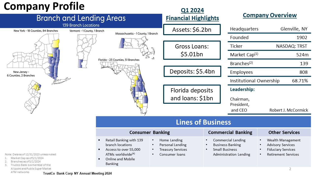 TrustCo Bank Corp NY  2  Company Profile  Assets: $6.2bn  Gross Loans: $5.01bn  Deposits: $5.4bn  Q1 2024   Financial Highlights  Company Overview  Headquarters Glenville, NY  Founded 1902  Ticker NASDAQ: TRST  Market Cap(1) 524m  Branches(2) 139  Employees 808  Institutional Ownership 68.71%  Leadership:  Chairman,   President,    and CEO Robert J. McCormick   Note: Data as of 12/31/2023 unless noted:  Market Cap as of 5/1/2024  Branches as of 5/1/2024  Trustco Bank is a member of the Allpoint and Publix Super Market ATM networks  Lines of Business  Consumer Banking  Consumer  Commercial Banking  Other Services  Retail Banking with 139 branch locations  Access to over 55,000 ATMs worldwide(4)  Online and Mobile Banking  Home Lending  Personal Lending   Treasury Services  Consumer loans   Commercial Lending  Business Banking  Small Business Administration Lending   Wealth Management   Advisory Services   Fiduciary Services  Retirement Services  Florida deposits and loans: $1bn  TrustCo Bank Corp NY Annual Meeting 2024