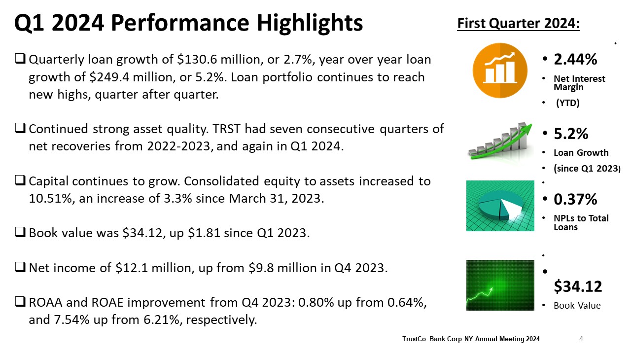 4  Q1 2024 Performance Highlights     2.44%  Net Interest Margin   (YTD)     5.2%   Loan Growth   (since Q1 2023)     0.37%  NPLs to Total Loans      $34.12  Book Value  Quarterly loan growth of $130.6 million, or 2.7%, year over year loan growth of $249.4 million, or 5.2%. Loan portfolio continues to reach new highs, quarter after quarter.   Continued strong asset quality. TRST had seven consecutive quarters of net recoveries from 2022-2023, and again in Q1 2024.  Capital continues to grow. Consolidated equity to assets increased to 10.51%, an increase of 3.3% since March 31, 2023.   Book value was $34.12, up $1.81 since Q1 2023.   Net income of $12.1 million, up from $9.8 million in Q4 2023.   ROAA and ROAE improvement from Q4 2023: 0.80% up from 0.64%, and 7.54% up from 6.21%, respectively.   First Quarter 2024:   TrustCo Bank Corp NY Annual Meeting 2024
