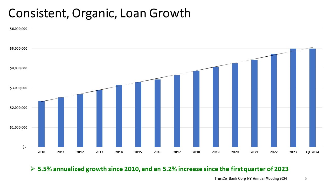 Consistent, Organic, Loan Growth  5  5.5% annualized growth since 2010, and an 5.2% increase since the first quarter of 2023  TrustCo Bank Corp NY Annual Meeting 2024