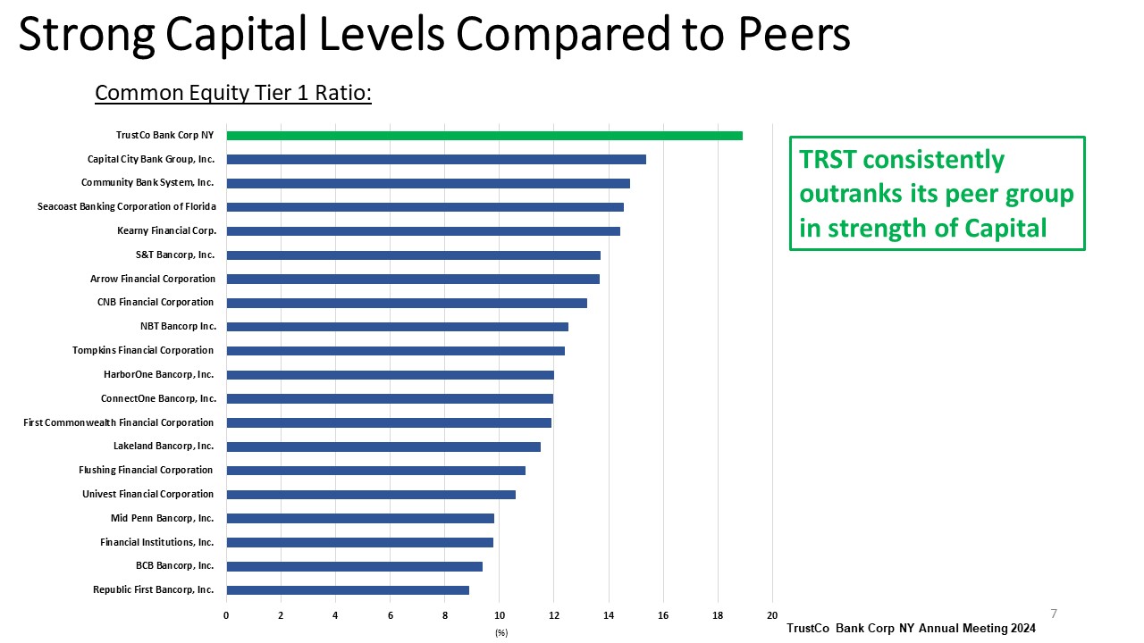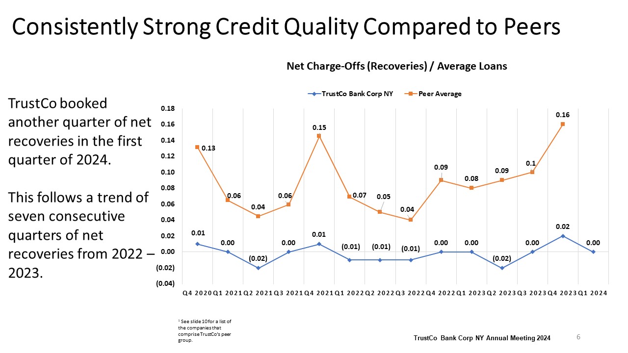Consistently Strong Credit Quality Compared to Peers  Source: S&P Capital IQ  6  Net Charge-Offs (Recoveries) / Average Loans  TrustCo booked another quarter of net recoveries in the first quarter of 2024.  This follows a trend of seven consecutive quarters of net recoveries from 2022 – 2023.  1 See slide 10 for a list of the companies that comprise TrustCo’s peer group.  TrustCo Bank Corp NY Annual Meeting 2024