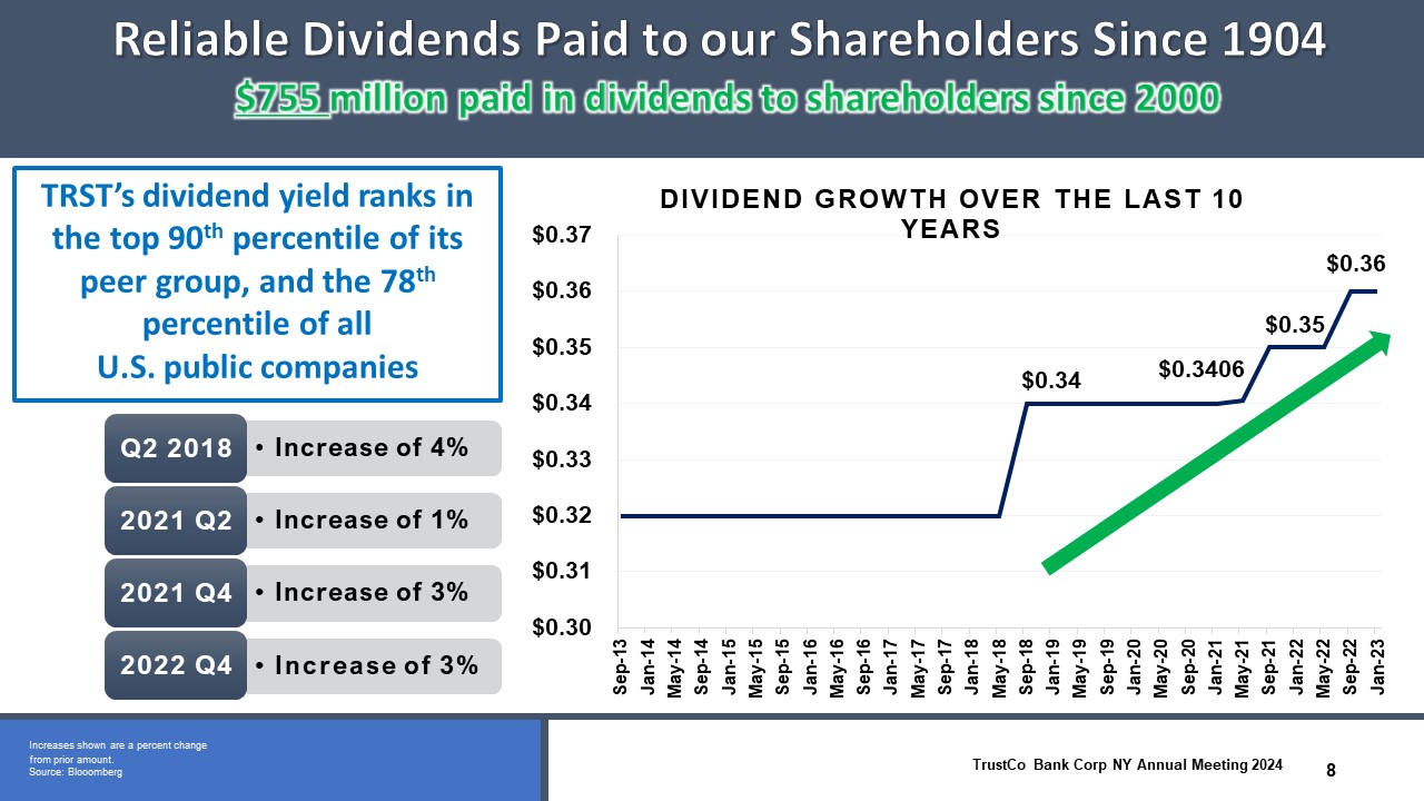 TrustCo Bank Corp NY Annual Meeting 2024  8  Increases shown are a percent change from prior amount.   Source: Blooomberg  Reliable Dividends Paid to our Shareholders Since 1904  $755 million paid in dividends to shareholders since 2000   TRST’s dividend yield ranks in the top 90th percentile of its peer group, and the 78th percentile of all   U.S. public companies