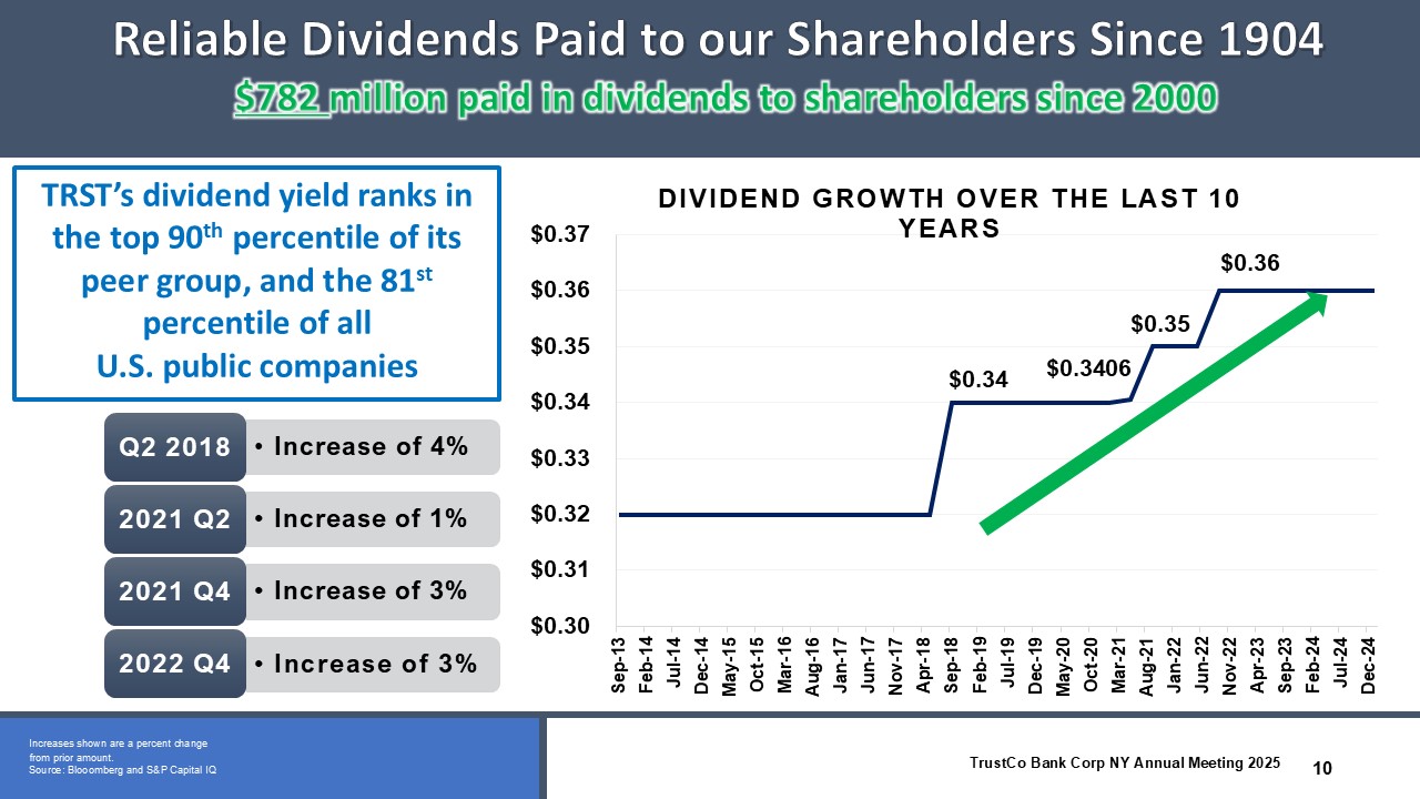 As of December 31, 2023  TrustCo Bank Corp NY   9  Strong Capital Levels Compared to Peers  Common Equity Tier 1 Ratio:  TRST consistently outranks its peer group in strength of Capital  (%)  TrustCo Bank Corp NY Annual Meeting 2025