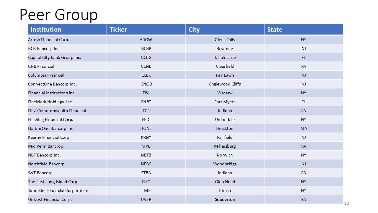 13  Peer Group  Institution  Ticker  City  State  Arrow Financial Corp.  AROW  Glens Falls  NY  BCB Bancorp Inc.  BCBP  Bayonne  NJ  Capital City Bank Group Inc.  CCBG  Tallahassee  FL  CNB Financial  CCNE  Clearfield  PA  Columbia Financial  CLBK  Fair Lawn  NJ  ConnectOne Bancorp Inc.  CNOB  Englewood Cliffs  NJ  Financial Institutions Inc.  FISI  Warsaw  NY  FineMark Holdings, Inc.  FNBT  Fort Myers  FL  First Commonwealth Financial  FCF  Indiana  PA  Flushing Financial Corp.  FFIC  Uniondale  NY  HarborOne Bancorp Inc  HONE  Brockton  MA  Kearny Financial Corp.  KRNY  Fairfield  NJ  Mid Penn Bancrop  MPB  Millersburg  PA  NBT Bancorp Inc.  NBTB  Norwich  NY  Northfield Bancorp  NFBK  Woodbridge  NJ  S&T Bancorp  STBA  Indiana  PA  The First Long Island Corp.  FLIC  Glen Head  NY  Tompkins Financial Corporation  TMP  Ithaca  NY  Univest Financial Corp.  UVSP  Souderton  PA