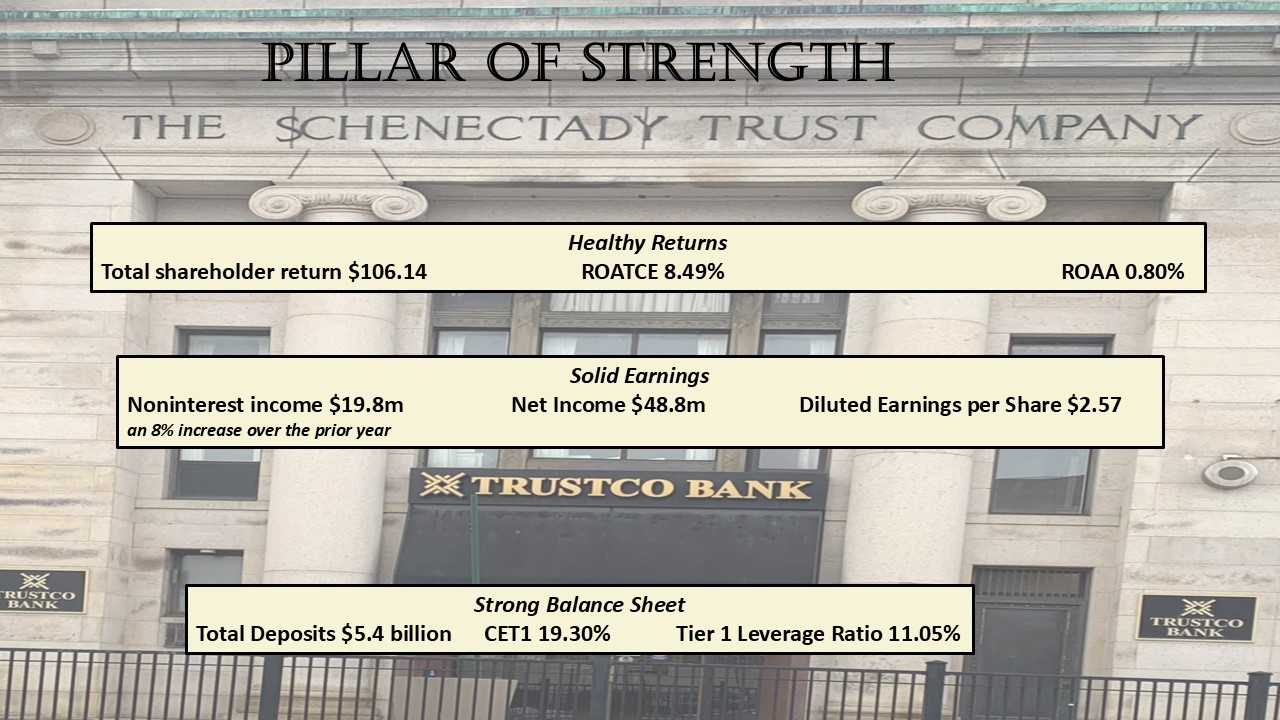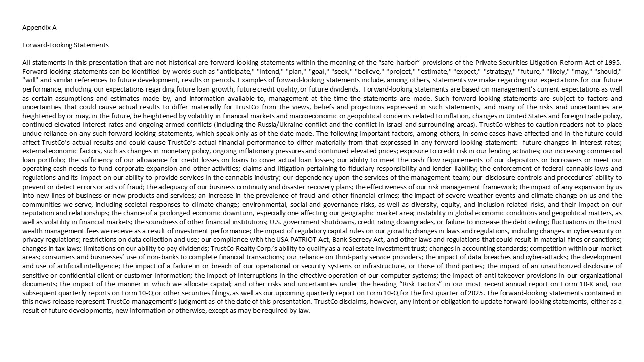 Appendix A     Forward-Looking Statements  All statements in this presentation that are not historical are forward-looking statements within the meaning of the “safe harbor” provisions of the Private Securities Litigation Reform Act of 1995. Forward-looking statements can be identified by words such as "anticipate," "intend," "plan," "goal," "seek," "believe," "project," "estimate," "expect," "strategy," "future," "likely," "may," "should," "will" and similar references to future development, results or periods. Examples of forward-looking statements include, among others, statements we make regarding our expectations for our future performance, including our expectations regarding future loan growth, future credit quality, or future dividends. Forward-looking statements are based on management’s current expectations as well as certain assumptions and estimates made by, and information available to, management at the time the statements are made. Such forward-looking statements are subject to factors and uncertainties that could cause actual results to differ materially for TrustCo from the views, beliefs and projections expressed in such statements, and many of the risks and uncertainties are heightened by or may, in the future, be heightened by volatility in financial markets and macroeconomic or geopolitical concerns related to inflation, changes in United States and foreign trade policy, continued elevated interest rates and ongoing armed conflicts (including the Russia/Ukraine conflict and the conflict in Israel and surrounding areas). TrustCo wishes to caution readers not to place undue reliance on any such forward-looking statements, which speak only as of the date made. The following important factors, among others, in some cases have affected and in the future could affect TrustCo’s actual results and could cause TrustCo’s actual financial performance to differ materially from that expressed in any forward-looking statement: future changes in interest rates; external economic factors, such as changes in monetary policy, ongoing inflationary pressures and continued elevated prices; exposure to credit risk in our lending activities; our increasing commercial loan portfolio; the sufficiency of our allowance for credit losses on loans to cover actual loan losses; our ability to meet the cash flow requirements of our depositors or borrowers or meet our operating cash needs to fund corporate expansion and other activities; claims and litigation pertaining to fiduciary responsibility and lender liability; the enforcement of federal cannabis laws and regulations and its impact on our ability to provide services in the cannabis industry; our dependency upon the services of the management team; our disclosure controls and procedures’ ability to prevent or detect errors or acts of fraud; the adequacy of our business continuity and disaster recovery plans; the effectiveness of our risk management framework; the impact of any expansion by us into new lines of business or new products and services; an increase in the prevalence of fraud and other financial crimes; the impact of severe weather events and climate change on us and the communities we serve, including societal responses to climate change; environmental, social and governance risks, as well as diversity, equity, and inclusion-related risks, and their impact on our reputation and relationships; the chance of a prolonged economic downturn, especially one affecting our geographic market area; instability in global economic conditions and geopolitical matters, as well as volatility in financial markets; the soundness of other financial institutions; U.S. government shutdowns, credit rating downgrades, or failure to increase the debt ceiling; fluctuations in the trust wealth management fees we receive as a result of investment performance; the impact of regulatory capital rules on our growth; changes in laws and regulations, including changes in cybersecurity or privacy regulations; restrictions on data collection and use; our compliance with the USA PATRIOT Act, Bank Secrecy Act, and other laws and regulations that could result in material fines or sanctions; changes in tax laws; limitations on our ability to pay dividends; TrustCo Realty Corp.’s ability to qualify as a real estate investment trust; changes in accounting standards; competition within our market areas; consumers and businesses’ use of non-banks to complete financial transactions; our reliance on third-party service providers; the impact of data breaches and cyber-attacks; the development and use of artificial intelligence; the impact of a failure in or breach of our operational or security systems or infrastructure, or those of third parties; the impact of an unauthorized disclosure of sensitive or confidential client or customer information; the impact of interruptions in the effective operation of our computer systems; the impact of anti-takeover provisions in our organizational documents; the impact of the manner in which we allocate capital; and other risks and uncertainties under the heading “Risk Factors” in our most recent annual report on Form 10-K and, our subsequent quarterly reports on Form 10-Q or other securities filings, as well as our upcoming quarterly report on Form 10-Q for the first quarter of 2025. The forward-looking statements contained in this news release represent TrustCo management’s judgment as of the date of this presentation. TrustCo disclaims, however, any intent or obligation to update forward-looking statements, either as a result of future developments, new information or otherwise, except as may be required by law.