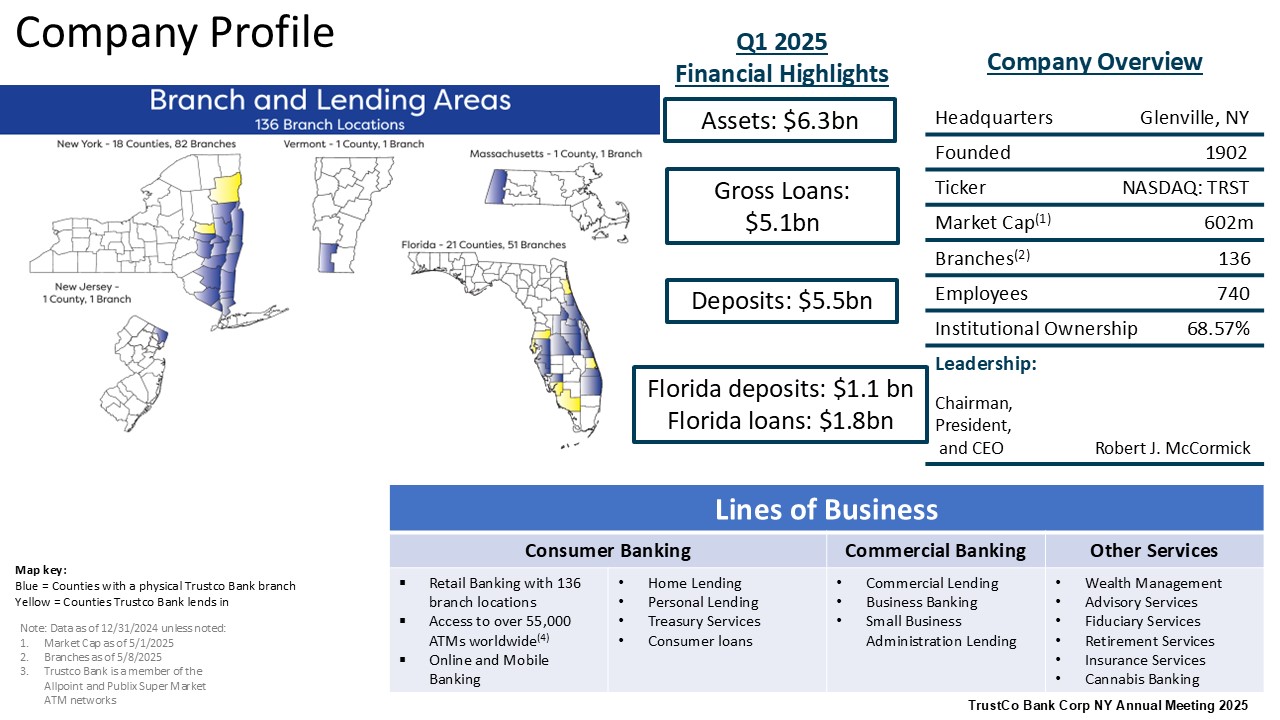 TrustCo Bank Corp NY  2  Company Profile  Assets: $6.3bn  Gross Loans: $5.1bn  Deposits: $5.5bn  Q1 2025   Financial Highlights  Company Overview  Headquarters Glenville, NY  Founded 1902  Ticker NASDAQ: TRST  Market Cap(1) 602m  Branches(2) 136  Employees 740  Institutional Ownership 68.57%  Leadership:  Chairman,   President,    and CEO Robert J. McCormick   Note: Data as of 12/31/2024 unless noted:  Market Cap as of 5/1/2025  Branches as of 5/8/2025  Trustco Bank is a member of the Allpoint and Publix Super Market ATM networks  Lines of Business  Consumer Banking  Consumer  Commercial Banking  Other Services  Retail Banking with 136 branch locations  Access to over 55,000 ATMs worldwide(4)  Online and Mobile Banking  Home Lending  Personal Lending   Treasury Services  Consumer loans   Commercial Lending  Business Banking  Small Business Administration Lending   Wealth Management   Advisory Services   Fiduciary Services  Retirement Services  Insurance Services  Cannabis Banking  Florida deposits: $1.1 bn  Florida loans: $1.8bn  TrustCo Bank Corp NY Annual Meeting 2025  Map key:  Blue = Counties with a physical Trustco Bank branch  Yellow = Counties Trustco Bank lends in