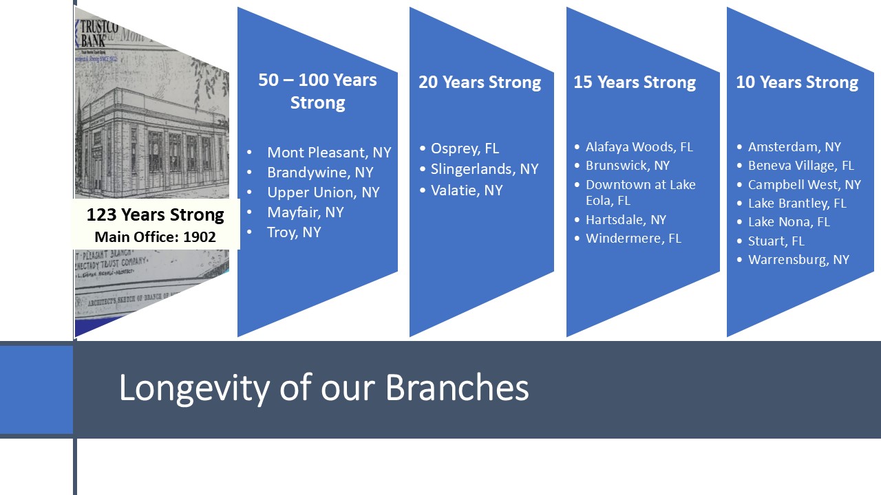 Longevity of our Branches  Mont Pleasant, NY  Brandywine, NY  Upper Union, NY  Mayfair, NY  Troy, NY  123 Years Strong  Main Office: 1902