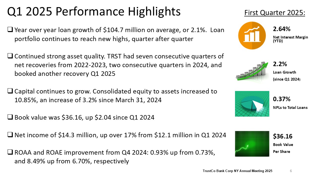 6  Q1 2025 Performance Highlights     2.64%  Net Interest Margin (YTD)     2.2%   Loan Growth   (since Q1 2024)     0.37%  NPLs to Total Loans     $36.16  Book Value  Per Share  Year over year loan growth of $104.7 million on average, or 2.1%. Loan portfolio continues to reach new highs, quarter after quarter  Continued strong asset quality. TRST had seven consecutive quarters of net recoveries from 2022-2023, two consecutive quarters in 2024, and booked another recovery Q1 2025  Capital continues to grow. Consolidated equity to assets increased to 10.85%, an increase of 3.2% since March 31, 2024  Book value was $36.16, up $2.04 since Q1 2024  Net income of $14.3 million, up over 17% from $12.1 million in Q1 2024  ROAA and ROAE improvement from Q4 2024: 0.93% up from 0.73%, and 8.49% up from 6.70%, respectively  First Quarter 2025:   TrustCo Bank Corp NY Annual Meeting 2025