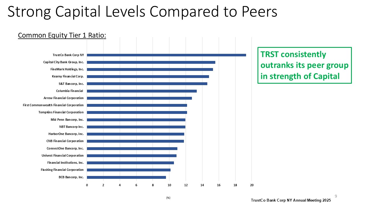 Consistently Strong Credit Quality Compared to Peers  8  Net Charge-Offs (Recoveries) / Average Loans  TrustCo continues to demonstrate exemplary credit quality through its sound underwriting and loan servicing  1 See slide 12 for a list of the companies that comprise TrustCo’s peer group.  TrustCo Bank Corp NY Annual Meeting 2025