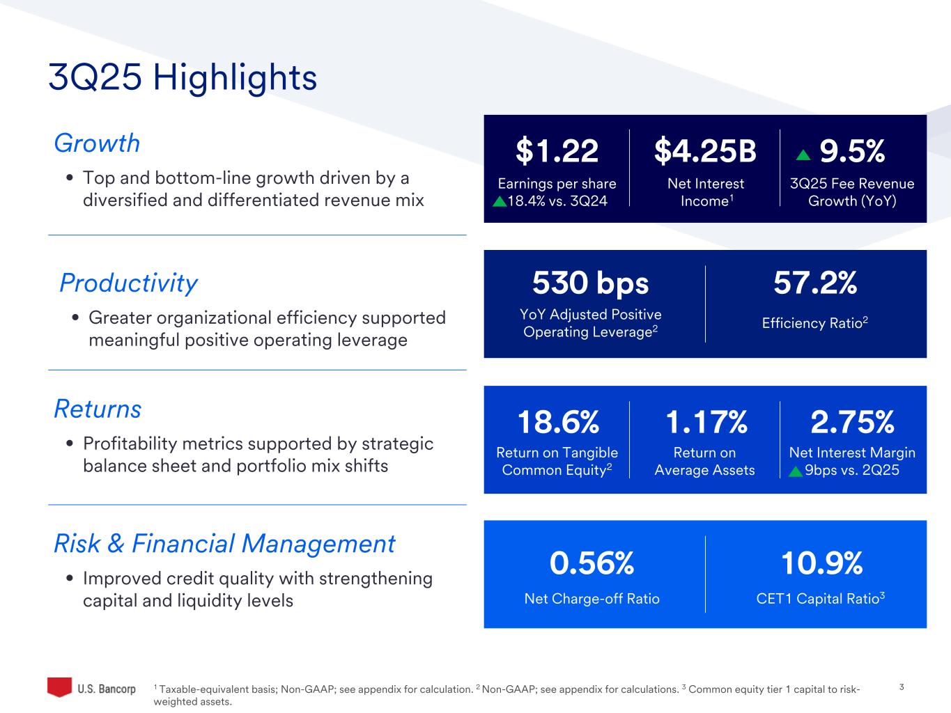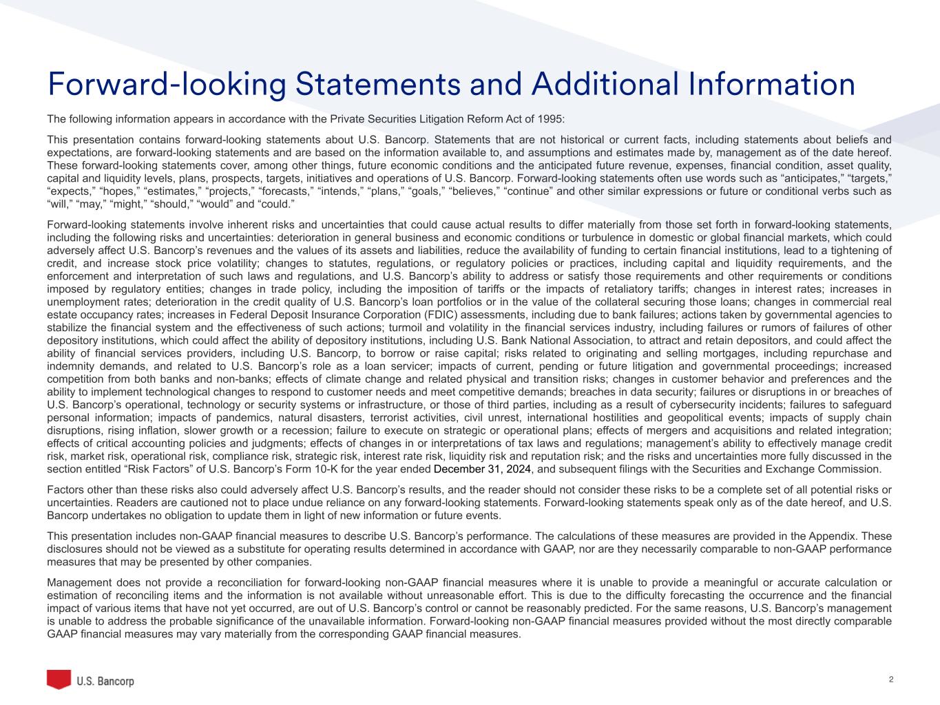 2©2025 U.S. Bank | Confidential Forward-looking Statements and Additional Information The following information appears in accordance with the Private Securities Litigation Reform Act of 1995: This presentation contains forward-looking statements about U.S. Bancorp. Statements that are not historical or current facts, including statements about beliefs and expectations, are forward-looking statements and are based on the information available to, and assumptions and estimates made by, management as of the date hereof. These forward-looking statements cover, among other things, future economic conditions and the anticipated future revenue, expenses, financial condition, asset quality, capital and liquidity levels, plans, prospects, targets, initiatives and operations of U.S. Bancorp. Forward-looking statements often use words such as “anticipates,” “targets,” “expects,” “hopes,” “estimates,” “projects,” “forecasts,” “intends,” “plans,” “goals,” “believes,” “continue” and other similar expressions or future or conditional verbs such as “will,” “may,” “might,” “should,” “would” and “could.” Forward-looking statements involve inherent risks and uncertainties that could cause actual results to differ materially from those set forth in forward-looking statements, including the following risks and uncertainties: deterioration in general business and economic conditions or turbulence in domestic or global financial markets, which could adversely affect U.S. Bancorp’s revenues and the values of its assets and liabilities, reduce the availability of funding to certain financial institutions, lead to a tightening of credit, and increase stock price volatility; changes to statutes, regulations, or regulatory policies or practices, including capital and liquidity requirements, and the enforcement and interpretation of such laws and regulations, and U.S. Bancorp’s ability to address or satisfy those requirements and other requirements or conditions imposed by regulatory entities; changes in trade policy, including the imposition of tariffs or the impacts of retaliatory tariffs; changes in interest rates; increases in unemployment rates; deterioration in the credit quality of U.S. Bancorp’s loan portfolios or in the value of the collateral securing those loans; changes in commercial real estate occupancy rates; increases in Federal Deposit Insurance Corporation (FDIC) assessments, including due to bank failures; actions taken by governmental agencies to stabilize the financial system and the effectiveness of such actions; turmoil and volatility in the financial services industry, including failures or rumors of failures of other depository institutions, which could affect the ability of depository institutions, including U.S. Bank National Association, to attract and retain depositors, and could affect the ability of financial services providers, including U.S. Bancorp, to borrow or raise capital; risks related to originating and selling mortgages, including repurchase and indemnity demands, and related to U.S. Bancorp’s role as a loan servicer; impacts of current, pending or future litigation and governmental proceedings; increased competition from both banks and non-banks; effects of climate change and related physical and transition risks; changes in customer behavior and preferences and the ability to implement technological changes to respond to customer needs and meet competitive demands; breaches in data security; failures or disruptions in or breaches of U.S. Bancorp’s operational, technology or security systems or infrastructure, or those of third parties, including as a result of cybersecurity incidents; failures to safeguard personal information; impacts of pandemics, natural disasters, terrorist activities, civil unrest, international hostilities and geopolitical events; impacts of supply chain disruptions, rising inflation, slower growth or a recession; failure to execute on strategic or operational plans; effects of mergers and acquisitions and related integration; effects of critical accounting policies and judgments; effects of changes in or interpretations of tax laws and regulations; management’s ability to effectively manage credit risk, market risk, operational risk, compliance risk, strategic risk, interest rate risk, liquidity risk and reputation risk; and the risks and uncertainties more fully discussed in the section entitled “Risk Factors” of U.S. Bancorp’s Form 10-K for the year ended December 31, 2024, and subsequent filings with the Securities and Exchange Commission. Factors other than these risks also could adversely affect U.S. Bancorp’s results, and the reader should not consider these risks to be a complete set of all potential risks or uncertainties. Readers are cautioned not to place undue reliance on any forward-looking statements. Forward-looking statements speak only as of the date hereof, and U.S. Bancorp undertakes no obligation to update them in light of new information or future events. This presentation includes non-GAAP financial measures to describe U.S. Bancorp’s performance. The calculations of these measures are provided in the Appendix. These disclosures should not be viewed as a substitute for operating results determined in accordance with GAAP, nor are they necessarily comparable to non-GAAP performance measures that may be presented by other companies. Management does not provide a reconciliation for forward-looking non-GAAP financial measures where it is unable to provide a meaningful or accurate calculation or estimation of reconciling items and the information is not available without unreasonable effort. This is due to the difficulty forecasting the occurrence and the financial impact of various items that have not yet occurred, are out of U.S. Bancorp’s control or cannot be reasonably predicted. For the same reasons, U.S. Bancorp’s management is un