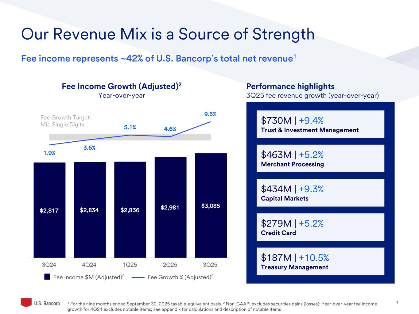 3 3Q25 Highlights Growth • Top and bottom-line growth driven by a diversified and differentiated revenue mix Productivity • Greater organizational efficiency supported meaningful positive operating leverage Returns • Profitability metrics supported by strategic balance sheet and portfolio mix shifts Risk & Financial Management • Improved credit quality with strengthening capital and liquidity levels 1 Taxable-equivalent basis; Non-GAAP; see appendix for calculation. 2 Non-GAAP; see appendix for calculations. 3 Common equity tier 1 capital to risk- weighted assets. 0.56% Net Charge-off Ratio 10.9% CET1 Capital Ratio3 $1.22 Net Interest Income1 $4.25B 3Q25 Fee Revenue Growth (YoY) 9.5% YoY Adjusted Positive Operating Leverage2 530 bps Efficiency Ratio2 57.2% Return on Tangible Common Equity2 18.6% Return on Average Assets 1.17% Net Interest Margin 9bps vs. 2Q25 2.75% Earnings per share 18.4% vs. 3Q24