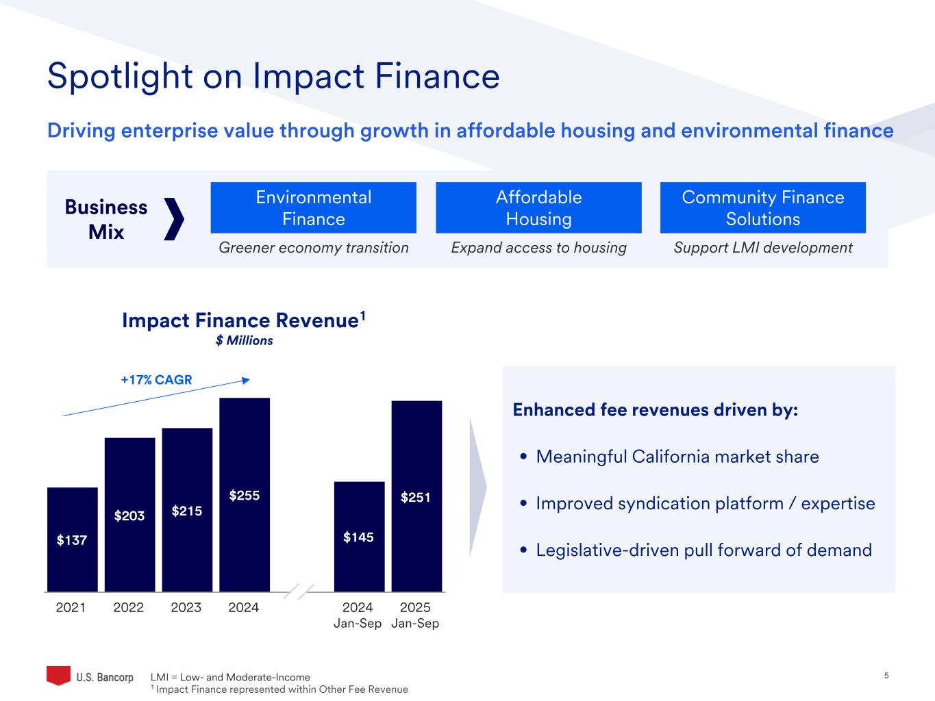 4 Fee Growth Target: Mid Single Digits Fee Income Growth (Adjusted)2 Year-over-year Performance highlights 3Q25 fee revenue growth (year-over-year) $463M | +5.2% Merchant Processing $187M | +10.5% Treasury Management $730M | +9.4% Trust & Investment Management $434M | +9.3% Capital Markets Our Revenue Mix is a Source of Strength $279M | +5.2% Credit Card Fee income represents ~42% of U.S. Bancorp’s total net revenue1 Fee Income $M (Adjusted)2 Fee Growth % (Adjusted)2 1 For the nine months ended September 30, 2025 taxable-equivalent basis. 2 Non-GAAP; excludes securities gains (losses); Year-over-year fee income growth for 4Q24 excludes notable items; see appendix for calculations and description of notable items $2,817 $2,834 $2,836 $2,981 $3,085 1.9% 3.6% 5.1% 4.6% 9.5% 3Q24 4Q24 1Q25 2Q25 3Q25