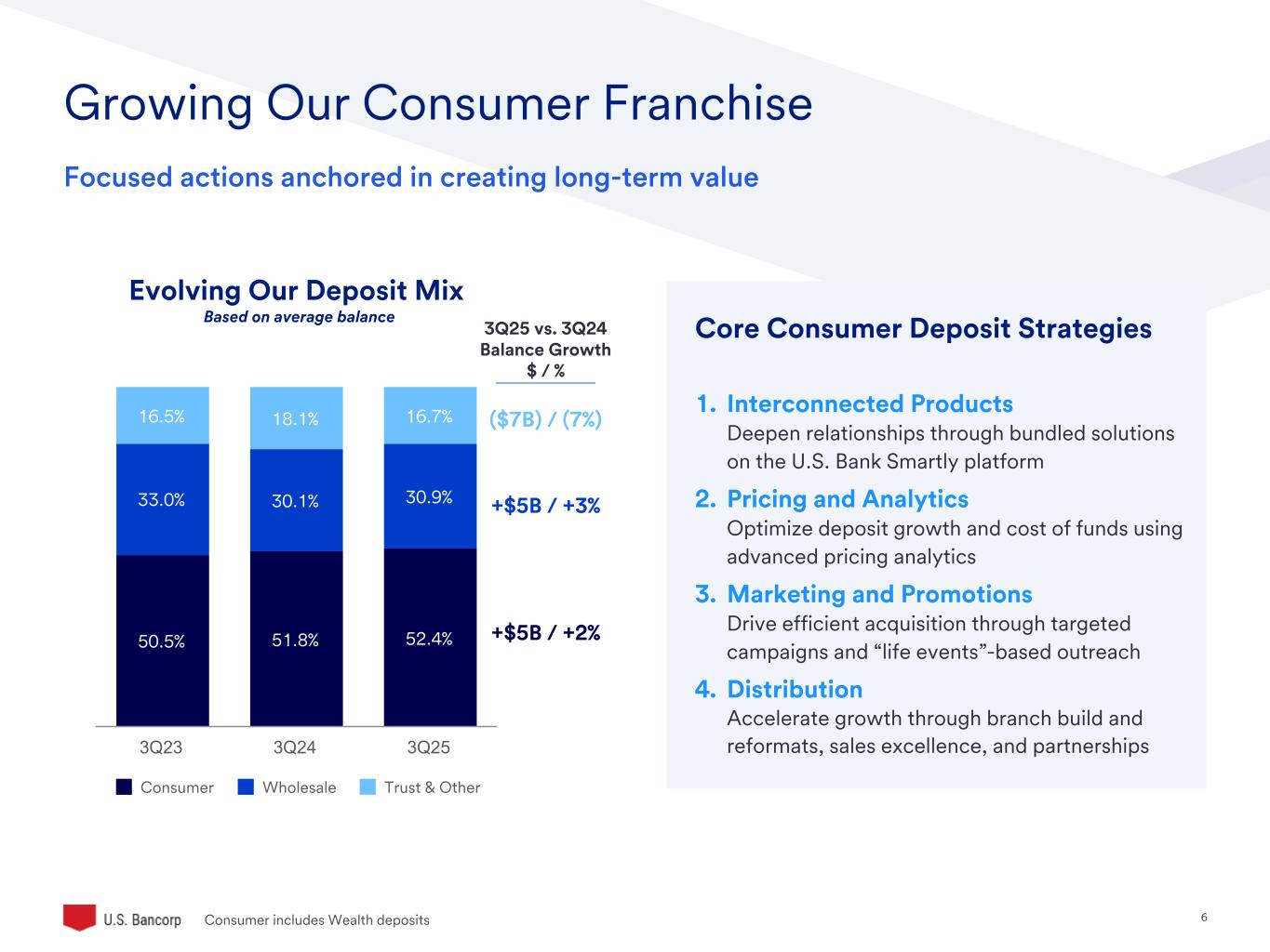 6 50.5% 51.8% 52.4% 33.0% 30.1% 30.9% 16.5% 18.1% 16.7% Consumer Wholesale Trust & Other 3Q23 3Q24 3Q25 Core Consumer Deposit Strategies 1. Interconnected Products Deepen relationships through bundled solutions on the U.S. Bank Smartly platform 2. Pricing and Analytics Optimize deposit growth and cost of funds using advanced pricing analytics 3. Marketing and Promotions Drive efficient acquisition through targeted campaigns and “life events”-based outreach 4. Distribution Accelerate growth through branch build and reformats, sales excellence, and partnerships Growing Our Consumer Franchise Evolving Our Deposit Mix Based on average balance 3Q25 vs. 3Q24 Balance Growth $ / % ($7B) / (7%) +$5B / +3% +$5B / +2% Focused actions anchored in creating long-term value Consumer includes Wealth deposits