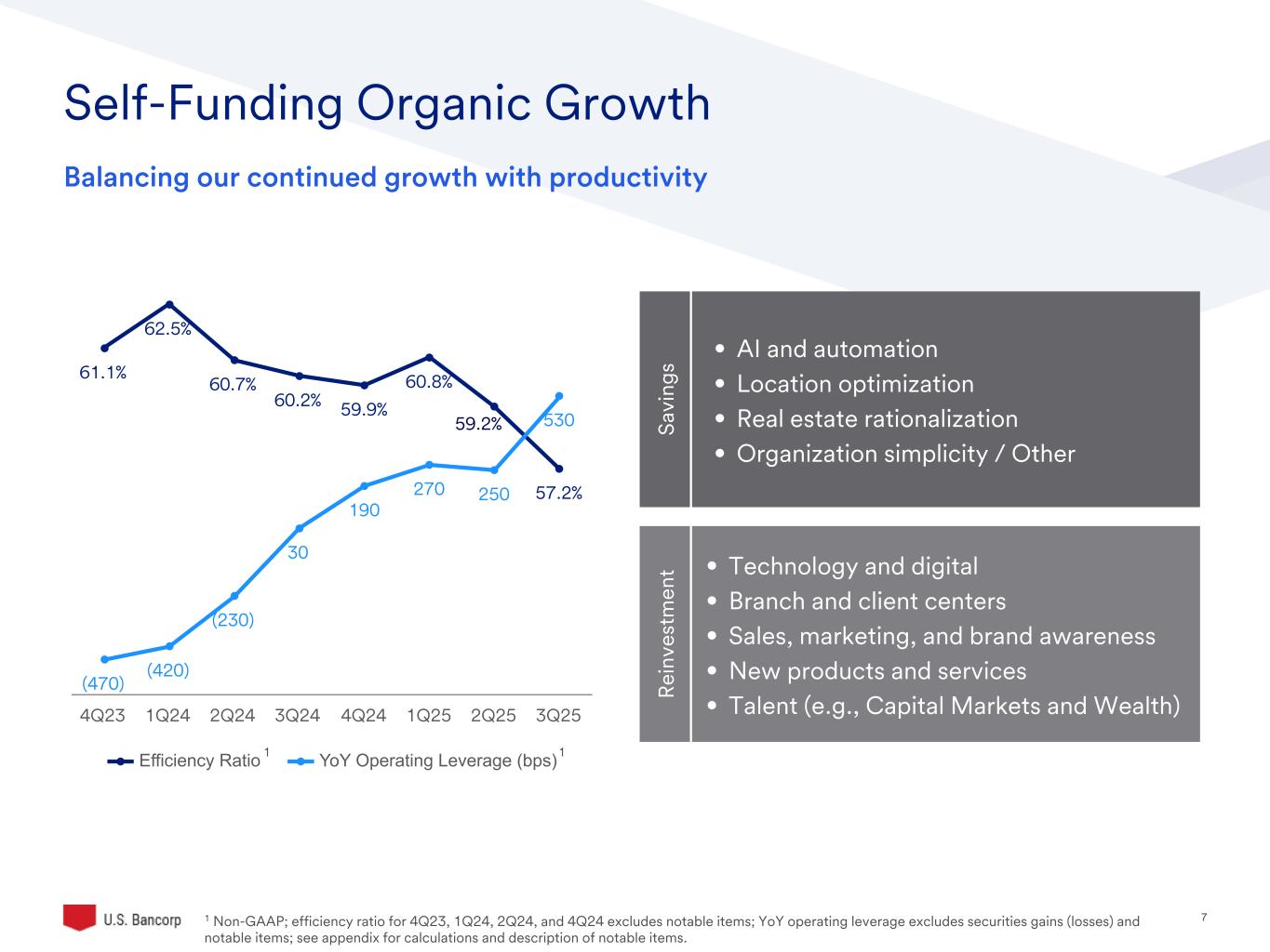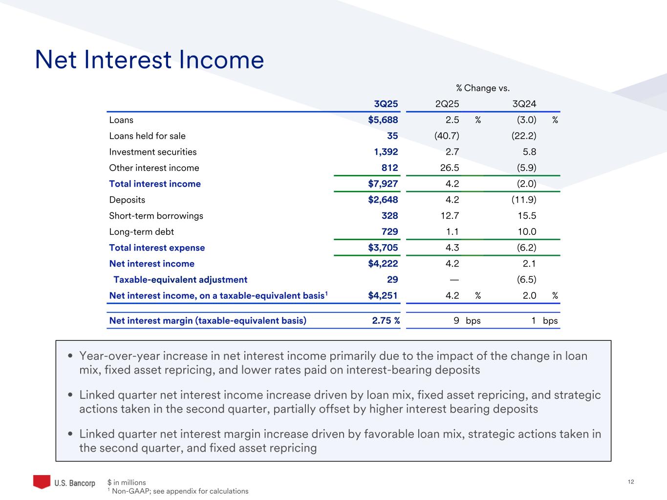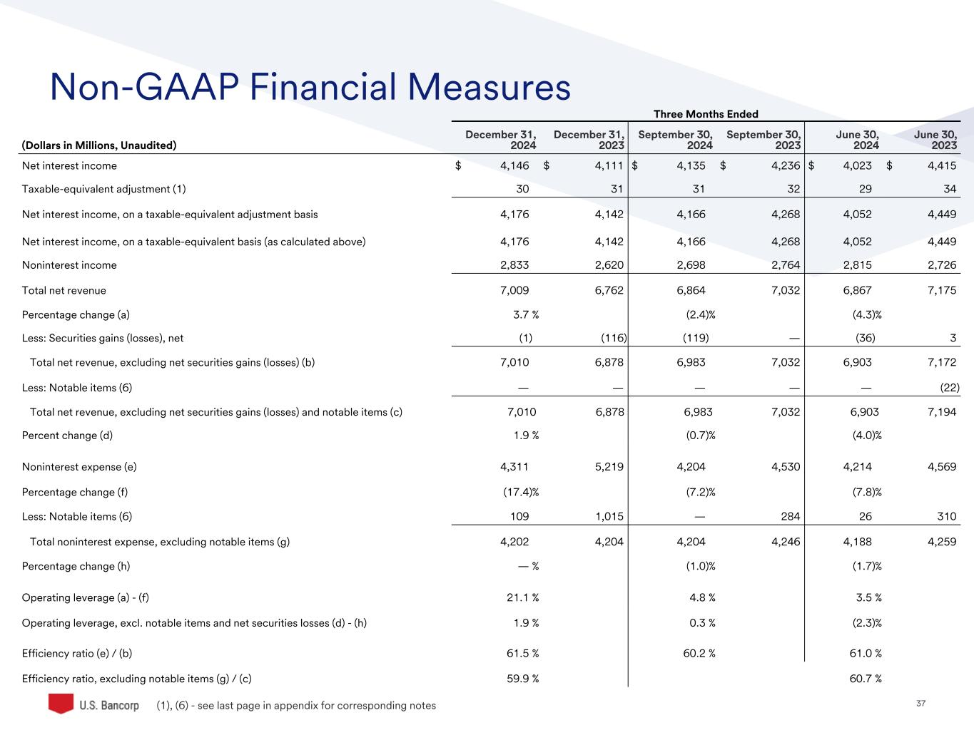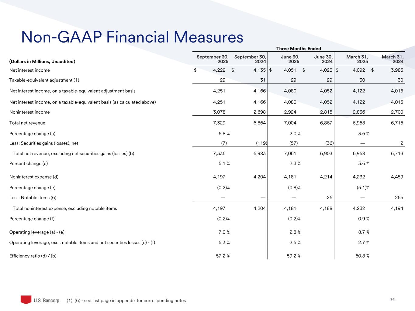 36©2025 U.S. Bank | Confidential Non-GAAP Financial Measures (1), (6) - see last page in appendix for corresponding notes Three Months Ended (Dollars in Millions, Unaudited) September 30, 2025 September 30, 2024 June 30, 2025 June 30, 2024 March 31, 2025 March 31, 2024 Net interest income $ 4,222 $ 4,135 $ 4,051 $ 4,023 $ 4,092 $ 3,985 Taxable-equivalent adjustment (1) 29 31 29 29 30 30 Net interest income, on a taxable-equivalent adjustment basis 4,251 4,166 4,080 4,052 4,122 4,015 Net interest income, on a taxable-equivalent basis (as calculated above) 4,251 4,166 4,080 4,052 4,122 4,015 Noninterest income 3,078 2,698 2,924 2,815 2,836 2,700 Total net revenue 7,329 6,864 7,004 6,867 6,958 6,715 Percentage change (a) 6.8 % 2.0 % 3.6 % Less: Securities gains (losses), net (7) (119) (57) (36) — 2 Total net revenue, excluding net securities gains (losses) (b) 7,336 6,983 7,061 6,903 6,958 6,713 Percent change (c) 5.1 % 2.3 % 3.6 % Noninterest expense (d) 4,197 4,204 4,181 4,214 4,232 4,459 Percentage change (e) (0.2) % (0.8) % (5.1) % Less: Notable items (6) — — — 26 — 265 Total noninterest expense, excluding notable items 4,197 4,204 4,181 4,188 4,232 4,194 Percentage change (f) (0.2) % (0.2) % 0.9 % Operating leverage (a) - (e) 7.0 % 2.8 % 8.7 % Operating leverage, excl. notable items and net securities losses (c) - (f) 5.3 % 2.5 % 2.7 % Efficiency ratio (d) / (b) 57.2 % 59.2 % 60.8 %