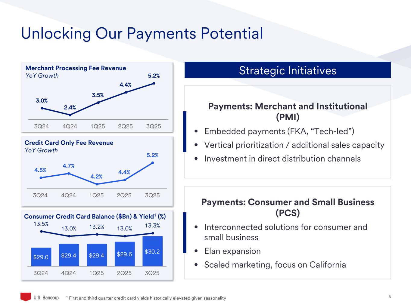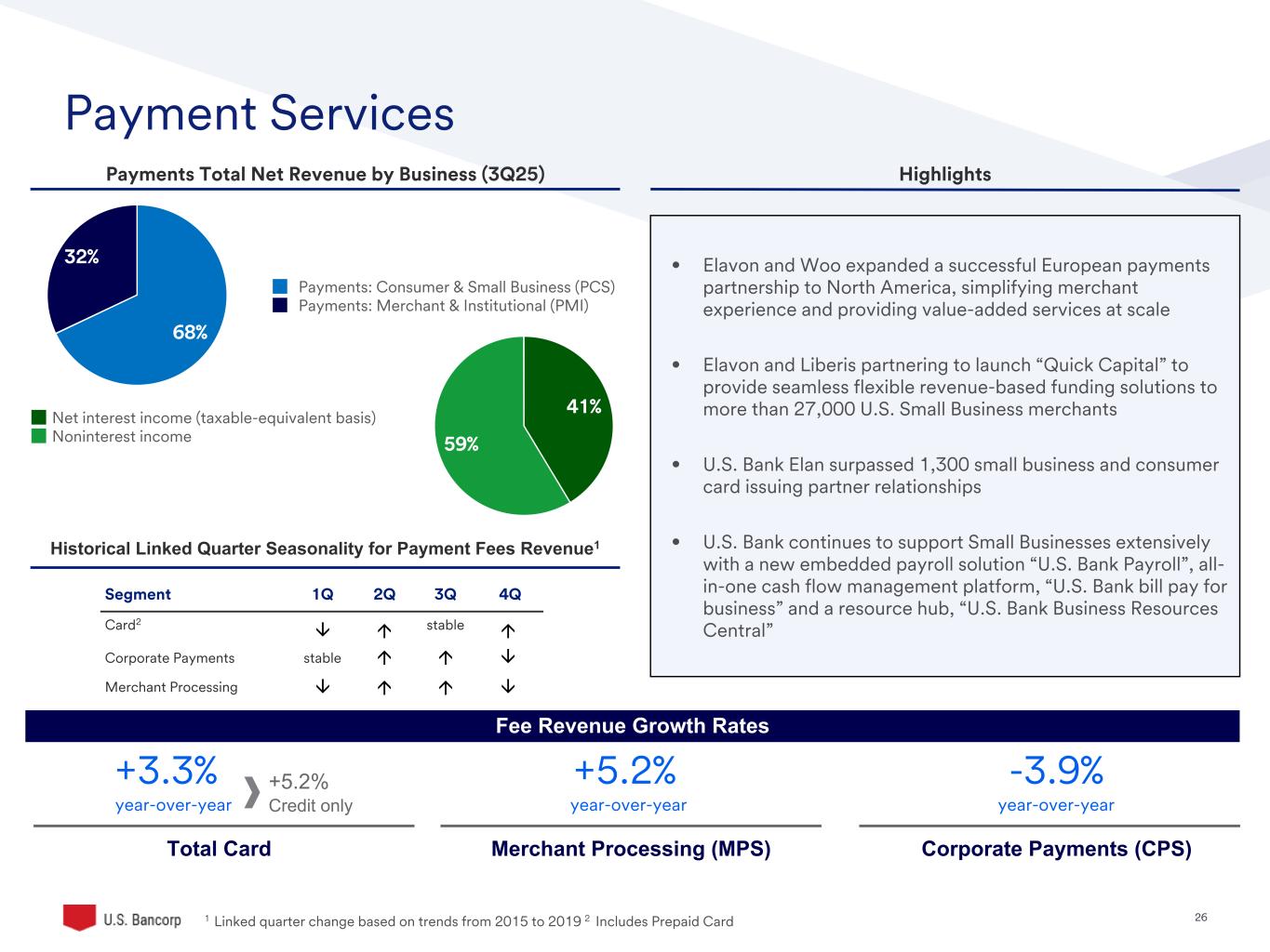 26©2025 U.S. Bank | Confidential • Elavon and Woo expanded a successful European payments partnership to North America, simplifying merchant experience and providing value-added services at scale • Elavon and Liberis partnering to launch “Quick Capital” to provide seamless flexible revenue-based funding solutions to more than 27,000 U.S. Small Business merchants • U.S. Bank Elan surpassed 1,300 small business and consumer card issuing partner relationships • U.S. Bank continues to support Small Businesses extensively with a new embedded payroll solution “U.S. Bank Payroll”, all- in-one cash flow management platform, “U.S. Bank bill pay for business” and a resource hub, “U.S. Bank Business Resources Central” Segment 1Q 2Q 3Q 4Q Card2 stable Corporate Payments stable Merchant Processing Merchant Processing (MPS) Corporate Payments (CPS)Total Card Payments Total Net Revenue by Business (3Q25) Highlights Historical Linked Quarter Seasonality for Payment Fees Revenue1 â â â á á á á á á â +3.3% year-over-year +5.2% year-over-year -3.9% year-over-year Payment Services +5.2% Credit only Fee Revenue Growth Rates 1 Linked quarter change based on trends from 2015 to 2019 2 Includes Prepaid Card 68% 32% Payments: Consumer & Small Business (PCS) Payments: Merchant & Institutional (PMI) 41% 59% Net interest income (taxable-equivalent basis) Noninterest income