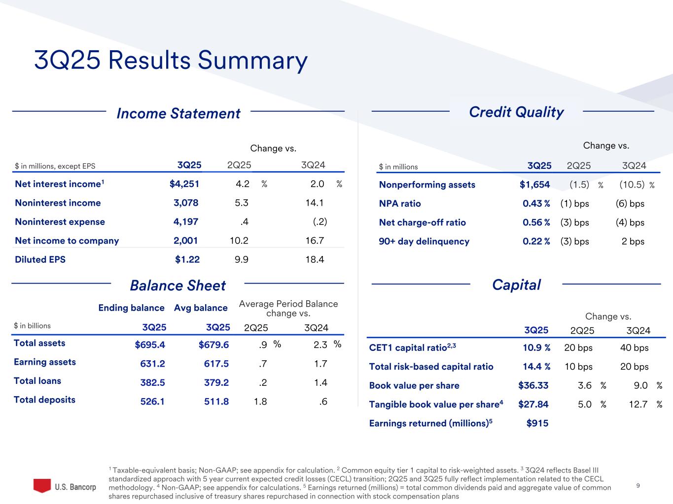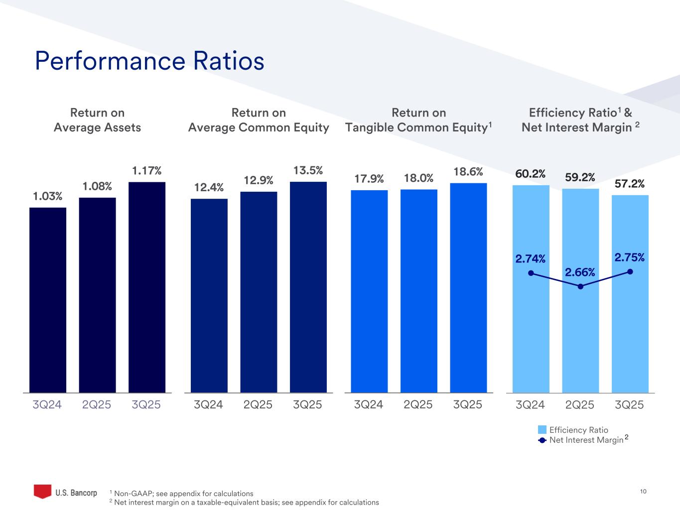 9©2025 U.S. Bank | Confidential 3Q25 Results Summary Income Statement Balance Sheet Capital 1 Taxable-equivalent basis; Non-GAAP; see appendix for calculation. 2 Common equity tier 1 capital to risk-weighted assets. 3 3Q24 reflects Basel III standardized approach with 5 year current expected credit losses (CECL) transition; 2Q25 and 3Q25 fully reflect implementation related to the CECL methodology. 4 Non-GAAP; see appendix for calculations. 5 Earnings returned (millions) = total common dividends paid and aggregate value of common shares repurchased inclusive of treasury shares repurchased in connection with stock compensation plans Change vs. $ in millions, except EPS 3Q25 2Q25 3Q24 Net interest income1 $4,251 4.2 % 2.0 % Noninterest income 3,078 5.3 14.1 Noninterest expense 4,197 .4 (.2) Net income to company 2,001 10.2 16.7 Diluted EPS $1.22 9.9 18.4 Change vs. $ in millions 3Q25 2Q25 3Q24 Nonperforming assets $1,654 (1.5) % (10.5) % NPA ratio 0.43 % (1) bps (6) bps Net charge-off ratio 0.56 % (3) bps (4) bps 90+ day delinquency 0.22 % (3) bps 2 bps Ending balance Avg balance Average Period Balance change vs. $ in billions 3Q25 3Q25 2Q25 3Q24 Total assets $695.4 $679.6 .9 % 2.3 % Earning assets 631.2 617.5 .7 1.7 Total loans 382.5 379.2 .2 1.4 Total deposits 526.1 511.8 1.8 .6 Change vs. 3Q25 2Q25 3Q24 CET1 capital ratio2,3 10.9 % 20 bps 40 bps Total risk-based capital ratio 14.4 % 10 bps 20 bps Book value per share $36.33 3.6 % 9.0 % Tangible book value per share4 $27.84 5.0 % 12.7 % Earnings returned (millions)5 $915 Credit Quality