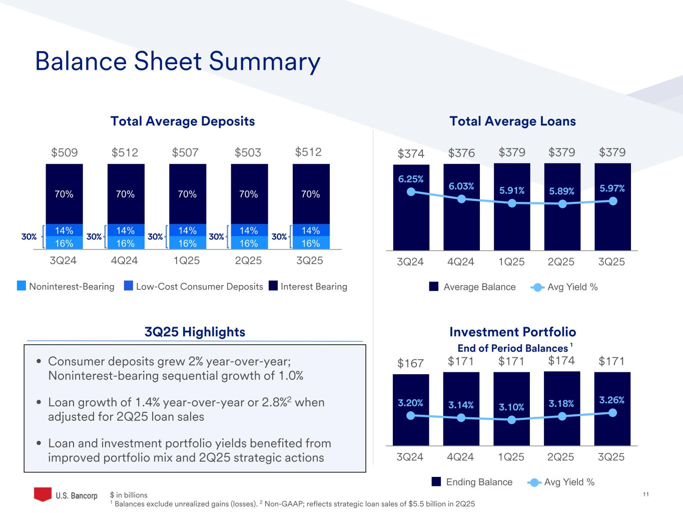 10©2025 U.S. Bank | Confidential 60.2% 59.2% 57.2% 2.74% 2.66% 2.75% Efficiency Ratio Net Interest Margin 3Q24 2Q25 3Q25 Performance Ratios 1.03% 1.08% 1.17% 3Q24 2Q25 3Q25 12.4% 12.9% 13.5% 3Q24 2Q25 3Q25 17.9% 18.0% 18.6% 3Q24 2Q25 3Q25 Return on Average Assets Return on Average Common Equity Return on Tangible Common Equity1 Efficiency Ratio1 & Net Interest Margin 2 2 1 Non-GAAP; see appendix for calculations 2 Net interest margin on a taxable-equivalent basis; see appendix for calculations