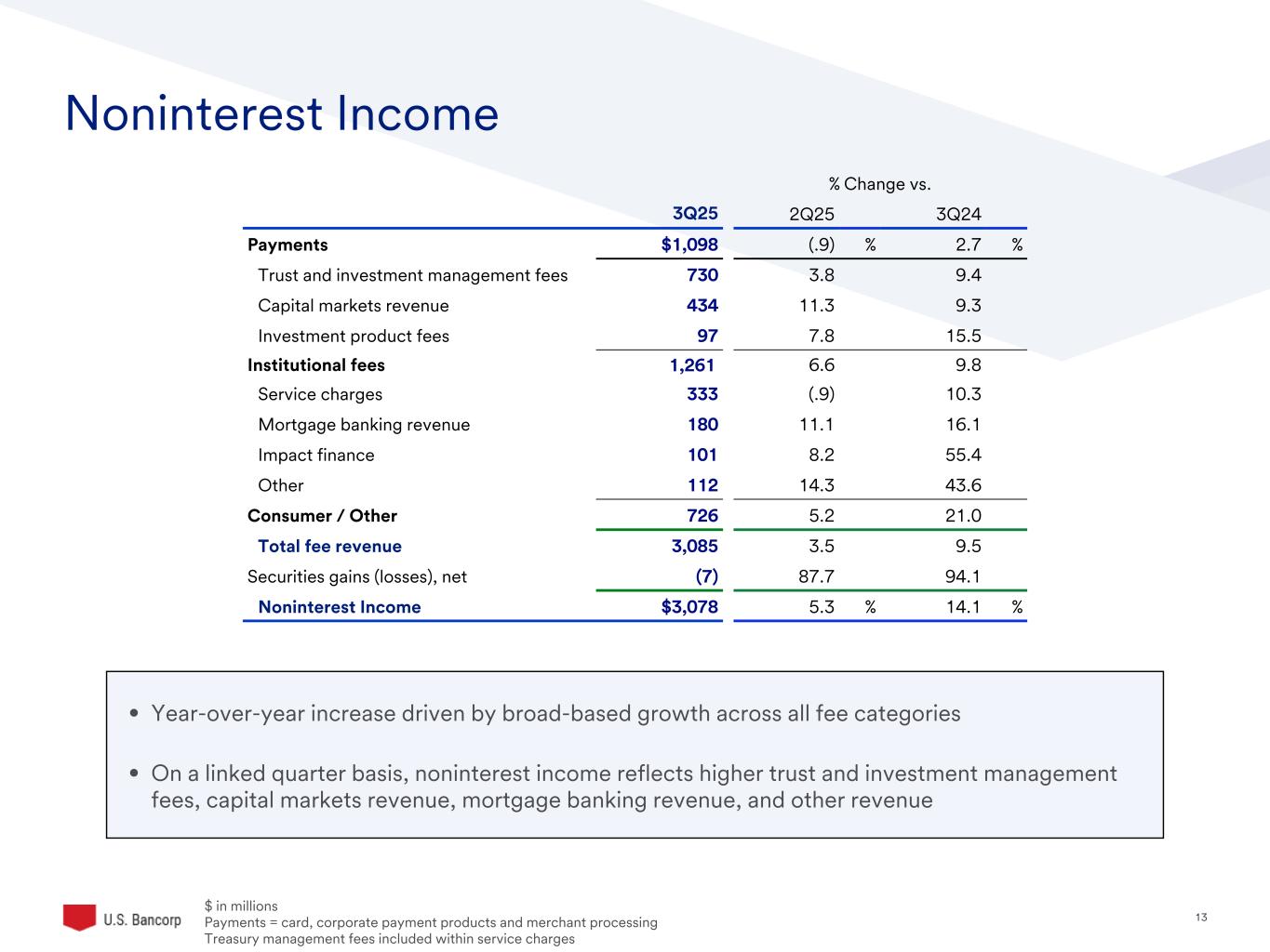 12©2025 U.S. Bank | Confidential • Year-over-year increase in net interest income primarily due to the impact of the change in loan mix, fixed asset repricing, and lower rates paid on interest-bearing deposits • Linked quarter net interest income increase driven by loan mix, fixed asset repricing, and strategic actions taken in the second quarter, partially offset by higher interest bearing deposits • Linked quarter net interest margin increase driven by favorable loan mix, strategic actions taken in the second quarter, and fixed asset repricing Net Interest Income % Change vs. 3Q25 2Q25 3Q24 Loans $5,688 2.5 % (3.0) % Loans held for sale 35 (40.7) (22.2) Investment securities 1,392 2.7 5.8 Other interest income 812 26.5 (5.9) Total interest income $7,927 4.2 (2.0) Deposits $2,648 4.2 (11.9) Short-term borrowings 328 12.7 15.5 Long-term debt 729 1.1 10.0 Total interest expense $3,705 4.3 (6.2) Net interest income $4,222 4.2 2.1 Taxable-equivalent adjustment 29 — (6.5) Net interest income, on a taxable-equivalent basis1 $4,251 4.2 % 2.0 % Net interest margin (taxable-equivalent basis) 2.75 % 9 bps 1 bps $ in millions 1 Non-GAAP; see appendix for calculations