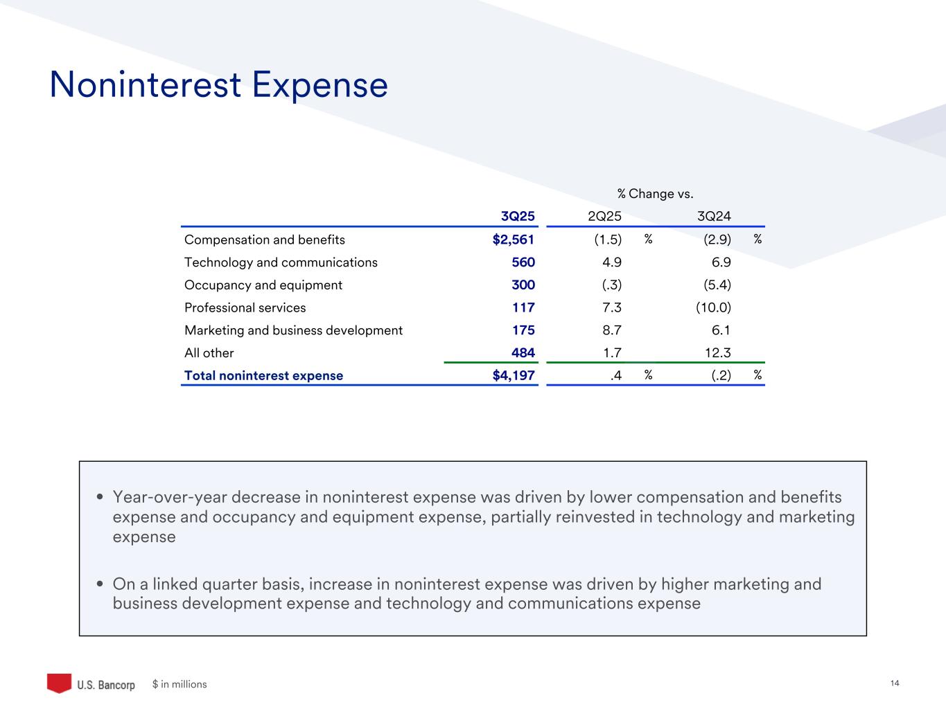 13©2025 U.S. Bank | Confidential Noninterest Income $ in millions Payments = card, corporate payment products and merchant processing Treasury management fees included within service charges % Change vs. 3Q25 2Q25 3Q24 Payments $1,098 (.9) % 2.7 % Trust and investment management fees 730 3.8 9.4 Capital markets revenue 434 11.3 9.3 Investment product fees 97 7.8 15.5 Institutional fees 1,261 6.6 9.8 Service charges 333 (.9) 10.3 Mortgage banking revenue 180 11.1 16.1 Impact finance 101 8.2 55.4 Other 112 14.3 43.6 Consumer / Other 726 5.2 21.0 Total fee revenue 3,085 3.5 9.5 Securities gains (losses), net (7) 87.7 94.1 Noninterest Income $3,078 5.3 % 14.1 % • Year-over-year increase driven by broad-based growth across all fee categories • On a linked quarter basis, noninterest income reflects higher trust and investment management fees, capital markets revenue, mortgage banking revenue, and other revenue