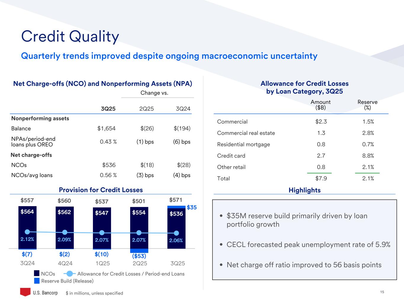 14©2025 U.S. Bank | Confidential Noninterest Expense $ in millions % Change vs. 3Q25 2Q25 3Q24 Compensation and benefits $2,561 (1.5) % (2.9) % Technology and communications 560 4.9 6.9 Occupancy and equipment 300 (.3) (5.4) Professional services 117 7.3 (10.0) Marketing and business development 175 8.7 6.1 All other 484 1.7 12.3 Total noninterest expense $4,197 .4 % (.2) % • Year-over-year decrease in noninterest expense was driven by lower compensation and benefits expense and occupancy and equipment expense, partially reinvested in technology and marketing expense • On a linked quarter basis, increase in noninterest expense was driven by higher marketing and business development expense and technology and communications expense