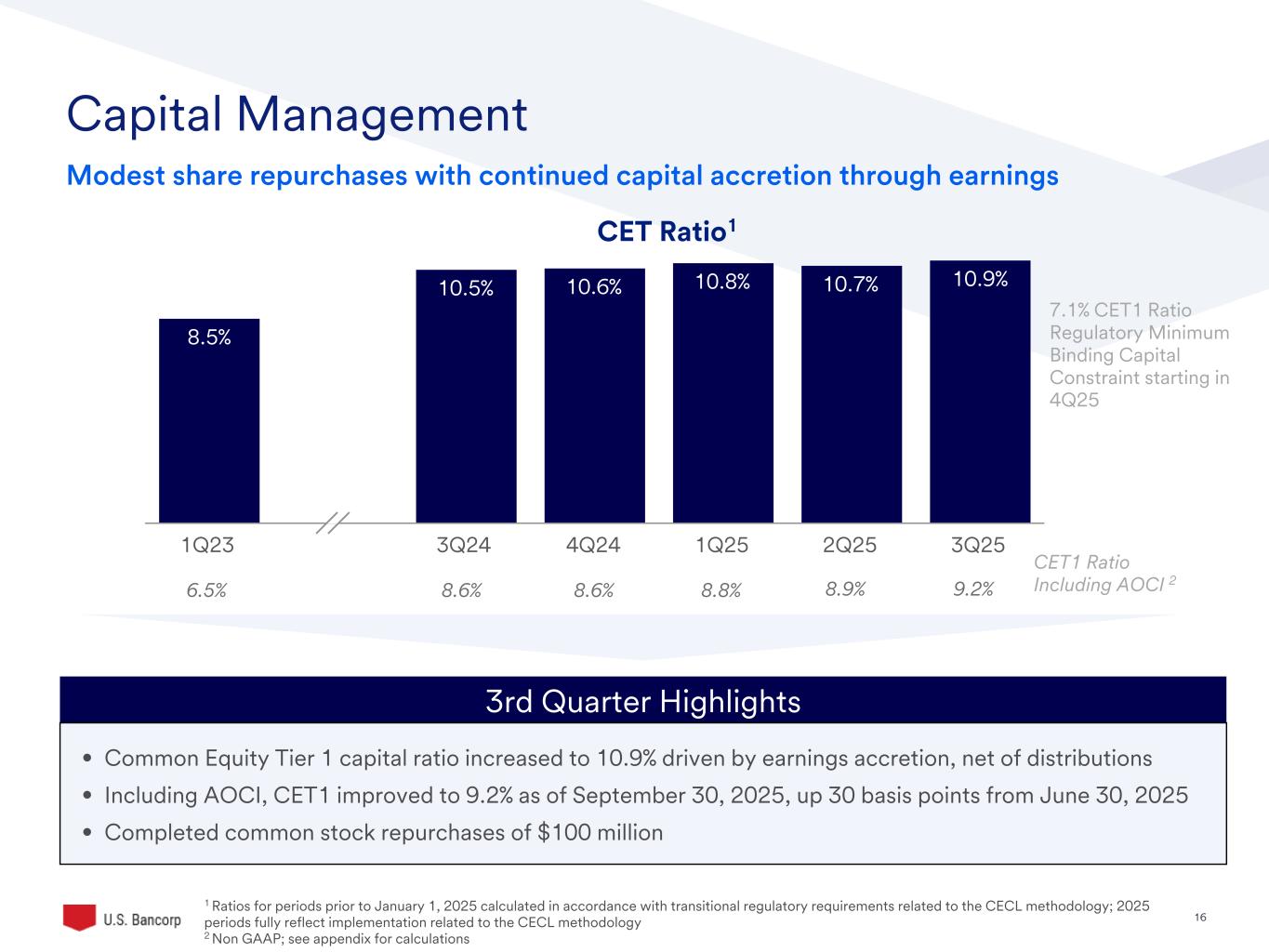 15©2025 U.S. Bank | Confidential $557 $560 $537 $501 $571 $564 $562 $547 $554 $536 $(7) $(2) $(10) 2.12% 2.09% 2.07% 2.07% 2.06% $ in millions, unless specified Credit Quality Quarterly trends improved despite ongoing macroeconomic uncertainty Amount ($B) Reserve (%) Commercial $2.3 1.5% Commercial real estate 1.3 2.8% Residential mortgage 0.8 0.7% Credit card 2.7 8.8% Other retail 0.8 2.1% Total $7.9 2.1% Change vs. 3Q25 2Q25 3Q24 Nonperforming assets Balance $1,654 $(26) $(194) NPAs/period-end loans plus OREO 0.43 % (1) bps (6) bps Net charge-offs NCOs $536 $(18) $(28) NCOs/avg loans 0.56 % (3) bps (4) bps Provision for Credit Losses Net Charge-offs (NCO) and Nonperforming Assets (NPA) Highlights Allowance for Credit Losses by Loan Category, 3Q25 • $35M reserve build primarily driven by loan portfolio growth • CECL forecasted peak unemployment rate of 5.9% • Net charge off ratio improved to 56 basis points NCOs Reserve Build (Release) Allowance for Credit Losses / Period-end Loans 3Q24 4Q24 1Q25 2Q25 3Q25 ($53) $35