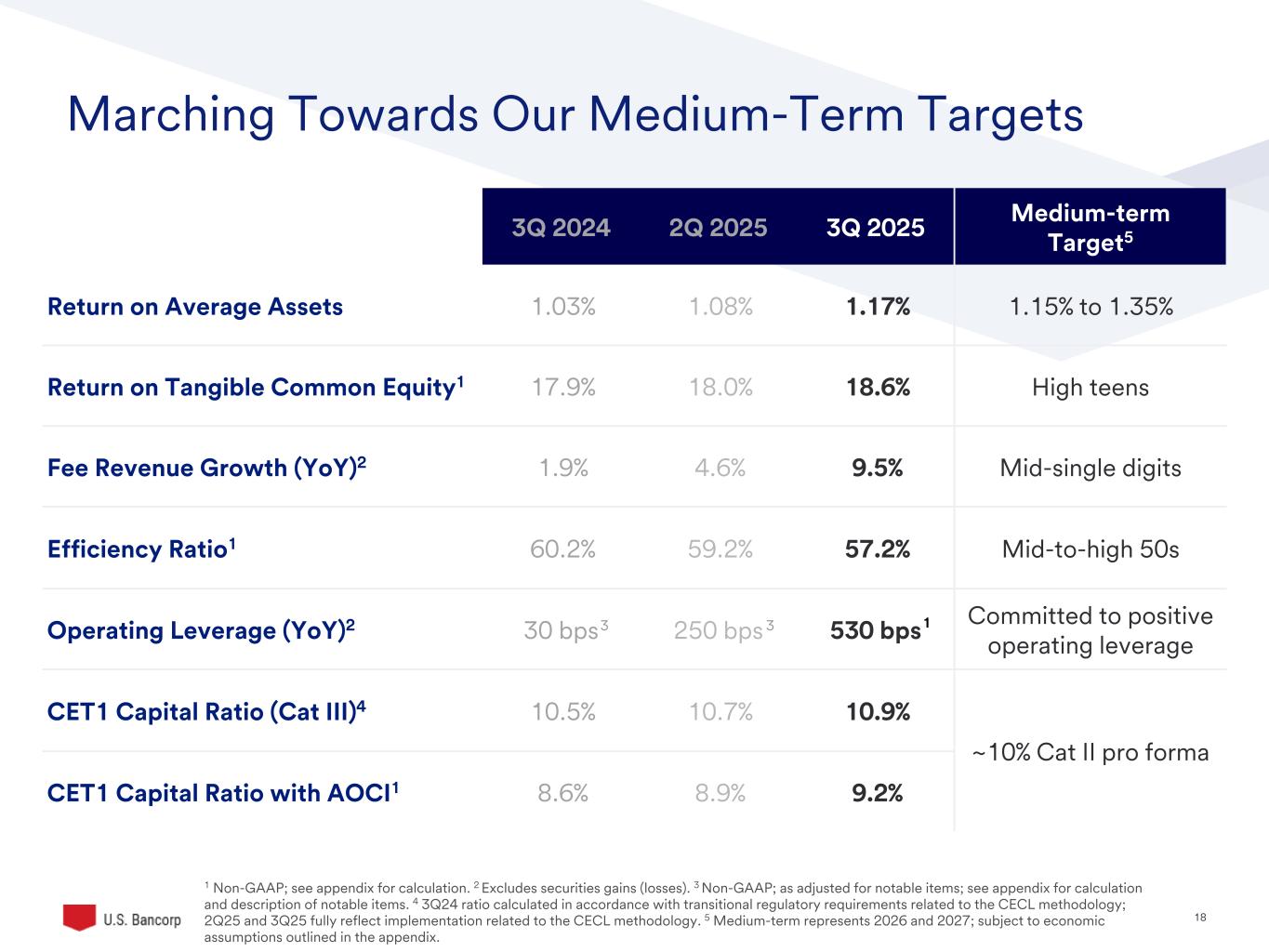17©2025 U.S. Bank | Confidential Guidance - 4Q 2025 All guidance is on an adjusted basis 1 Taxable-equivalent basis; see appendix for calculation; 2 Non-GAAP; excludes securities gains and losses; see appendix for calculations; 3 As calculated on a year-over-year basis; 4 Excludes notable items 3Q25 Performance Net interest income1 Total noninterest expense Positive operating leverage2,3 3Q Guidance 3Q Result $4.1B to $4.2B $4,251M $4.2B or Lower $4,197M 200+ bps 530 bps 4Q25 Guidance Net interest income1 Total fee revenue Total noninterest expense Positive operating leverage2,3,4 Total fee revenue ~$3.0B $3,085M Relatively stable vs. 3Q 2025 +1% to 1.5% vs. 3Q 2025 200+ bps ~$3.0B