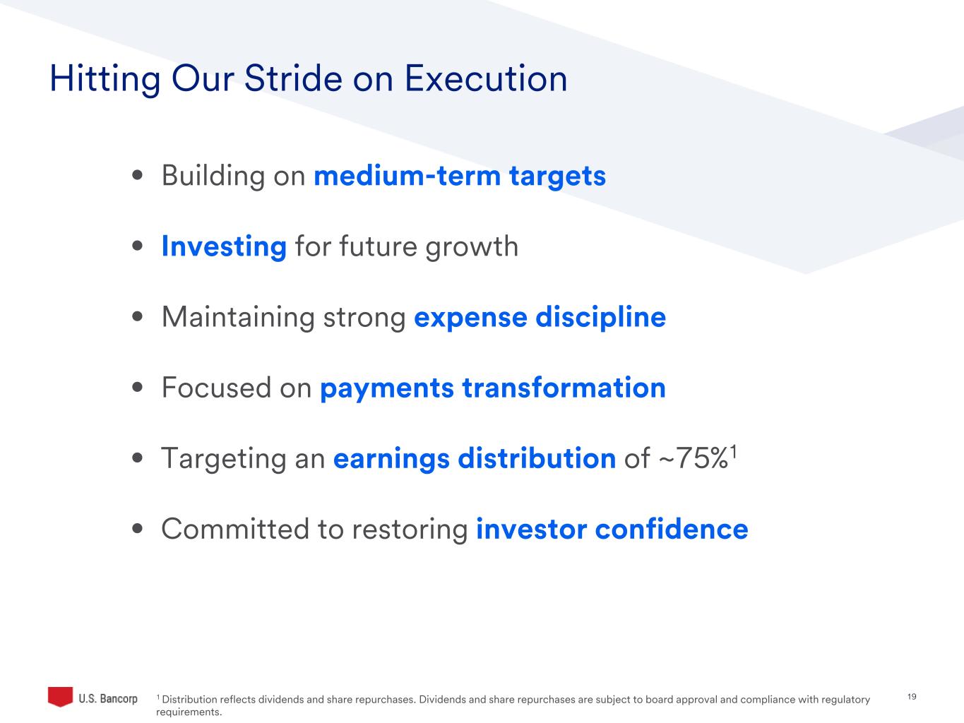 18©2025 U.S. Bank | Confidential Marching Towards Our Medium-Term Targets 1 Non-GAAP; see appendix for calculation. 2 Excludes securities gains (losses). 3 Non-GAAP; as adjusted for notable items; see appendix for calculation and description of notable items. 4 3Q24 ratio calculated in accordance with transitional regulatory requirements related to the CECL methodology; 2Q25 and 3Q25 fully reflect implementation related to the CECL methodology. 5 Medium-term represents 2026 and 2027; subject to economic assumptions outlined in the appendix. 3Q 2024 2Q 2025 3Q 2025 Medium-term Target5 Return on Average Assets 1.03% 1.08% 1.17% 1.15% to 1.35% Return on Tangible Common Equity1 17.9% 18.0% 18.6% High teens Fee Revenue Growth (YoY)2 1.9% 4.6% 9.5% Mid-single digits Efficiency Ratio1 60.2% 59.2% 57.2% Mid-to-high 50s Operating Leverage (YoY)2 30 bps 250 bps 530 bps Committed to positive operating leverage CET1 Capital Ratio (Cat III)4 10.5% 10.7% 10.9% ~10% Cat II pro forma CET1 Capital Ratio with AOCI1 8.6% 8.9% 9.2% 3 3 1