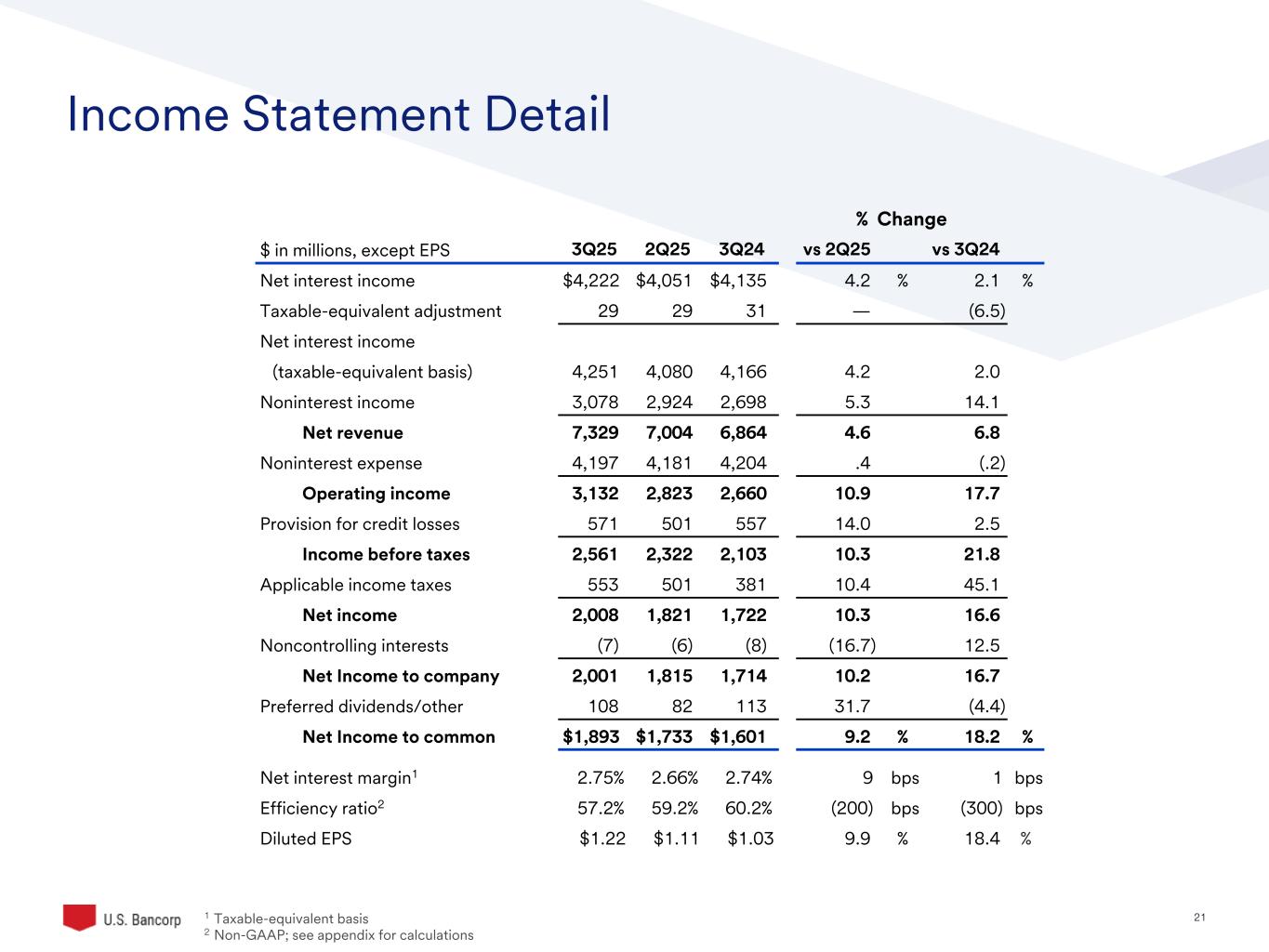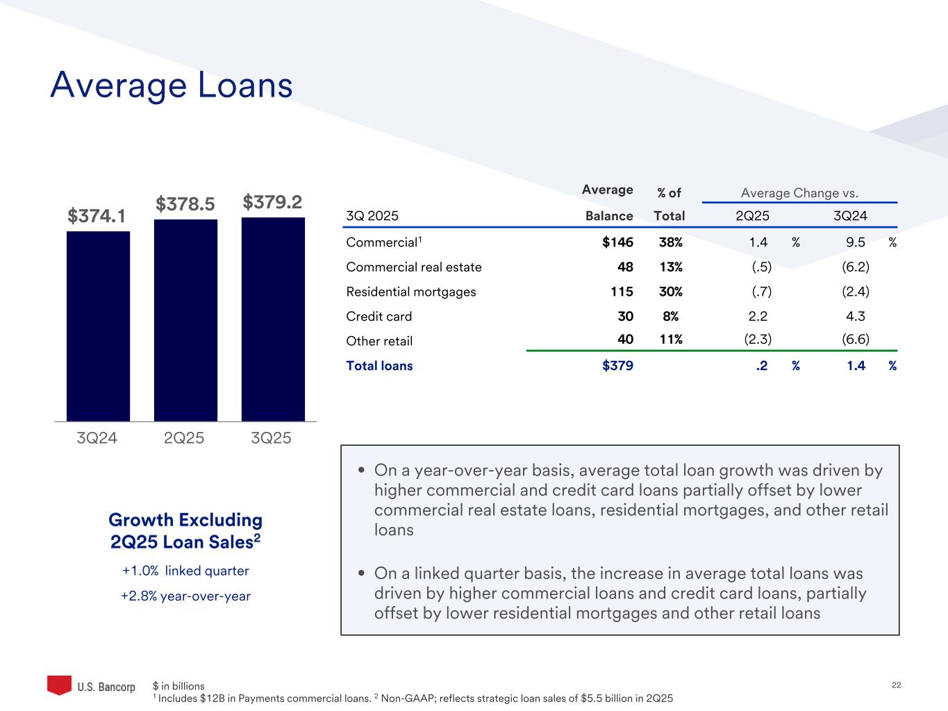 21©2025 U.S. Bank | Confidential Income Statement Detail 1 Taxable-equivalent basis 2 Non-GAAP; see appendix for calculations % Change $ in millions, except EPS 3Q25 2Q25 3Q24 vs 2Q25 vs 3Q24 Net interest income $4,222 $4,051 $4,135 4.2 % 2.1 % Taxable-equivalent adjustment 29 29 31 — (6.5) Net interest income (taxable-equivalent basis) 4,251 4,080 4,166 4.2 2.0 Noninterest income 3,078 2,924 2,698 5.3 14.1 Net revenue 7,329 7,004 6,864 4.6 6.8 Noninterest expense 4,197 4,181 4,204 .4 (.2) Operating income 3,132 2,823 2,660 10.9 17.7 Provision for credit losses 571 501 557 14.0 2.5 Income before taxes 2,561 2,322 2,103 10.3 21.8 Applicable income taxes 553 501 381 10.4 45.1 Net income 2,008 1,821 1,722 10.3 16.6 Noncontrolling interests (7) (6) (8) (16.7) 12.5 Net Income to company 2,001 1,815 1,714 10.2 16.7 Preferred dividends/other 108 82 113 31.7 (4.4) Net Income to common $1,893 $1,733 $1,601 9.2 % 18.2 % Net interest margin1 2.75% 2.66% 2.74% 9 bps 1 bps Efficiency ratio2 57.2% 59.2% 60.2% (200) bps (300) bps Diluted EPS $1.22 $1.11 $1.03 9.9 % 18.4 %