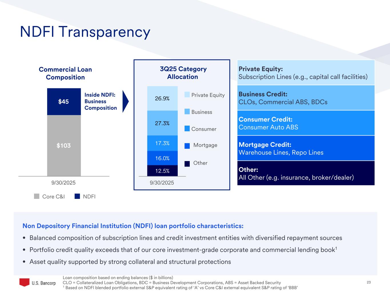23 $103 $45 Core C&I NDFI 9/30/2025 12.5% 16.0% 17.3% 27.3% 26.9% 9/30/2025 NDFI Transparency Loan composition based on ending balances ($ in billions) CLO = Collateralized Loan Obligations, BDC = Business Development Corporations, ABS = Asset Backed Security 1 Based on NDFI blended portfolio external S&P equivalent rating of ‘A’ vs Core C&I external equivalent S&P rating of ‘BBB’ 3Q25 Category Allocation Inside NDFI: Business Composition Commercial Loan Composition Private Equity: Subscription Lines (e.g., capital call facilities) Business Credit: CLOs, Commercial ABS, BDCs Consumer Credit: Consumer Auto ABS Mortgage Credit: Warehouse Lines, Repo Lines Other: All Other (e.g. insurance, broker/dealer) Private Equity Business Consumer Mortgage Other Non Depository Financial Institution (NDFI) loan portfolio characteristics: • Balanced composition of subscription lines and credit investment entities with diversified repayment sources • Portfolio credit quality exceeds that of our core investment-grade corporate and commercial lending book1 • Asset quality supported by strong collateral and structural protections