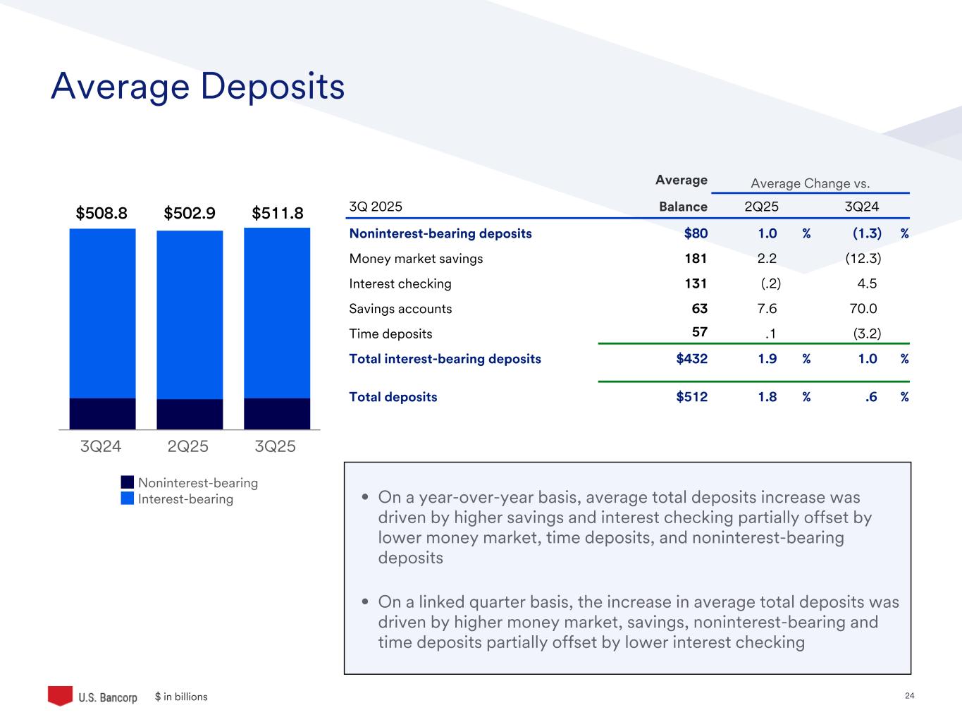 24©2025 U.S. Bank | Confidential Average Deposits • On a year-over-year basis, average total deposits increase was driven by higher savings and interest checking partially offset by lower money market, time deposits, and noninterest-bearing deposits • On a linked quarter basis, the increase in average total deposits was driven by higher money market, savings, noninterest-bearing and time deposits partially offset by lower interest checking $ in b llio s Noninterest-bearing Interest-bearing 3Q24 2Q25 3Q25 Average Average Change vs. 3Q 2025 Balance 2Q25 3Q24 Noninterest-bearing deposits $80 1.0 % (1.3) % Money market savings 181 2.2 (12.3) Interest checking 131 (.2) 4.5 Savings accounts 63 7.6 70.0 Time deposits 57 .1 (3.2) Total interest-bearing deposits $432 1.9 % 1.0 % Total deposits $512 1.8 % .6 % $511.8$502.9$508.8