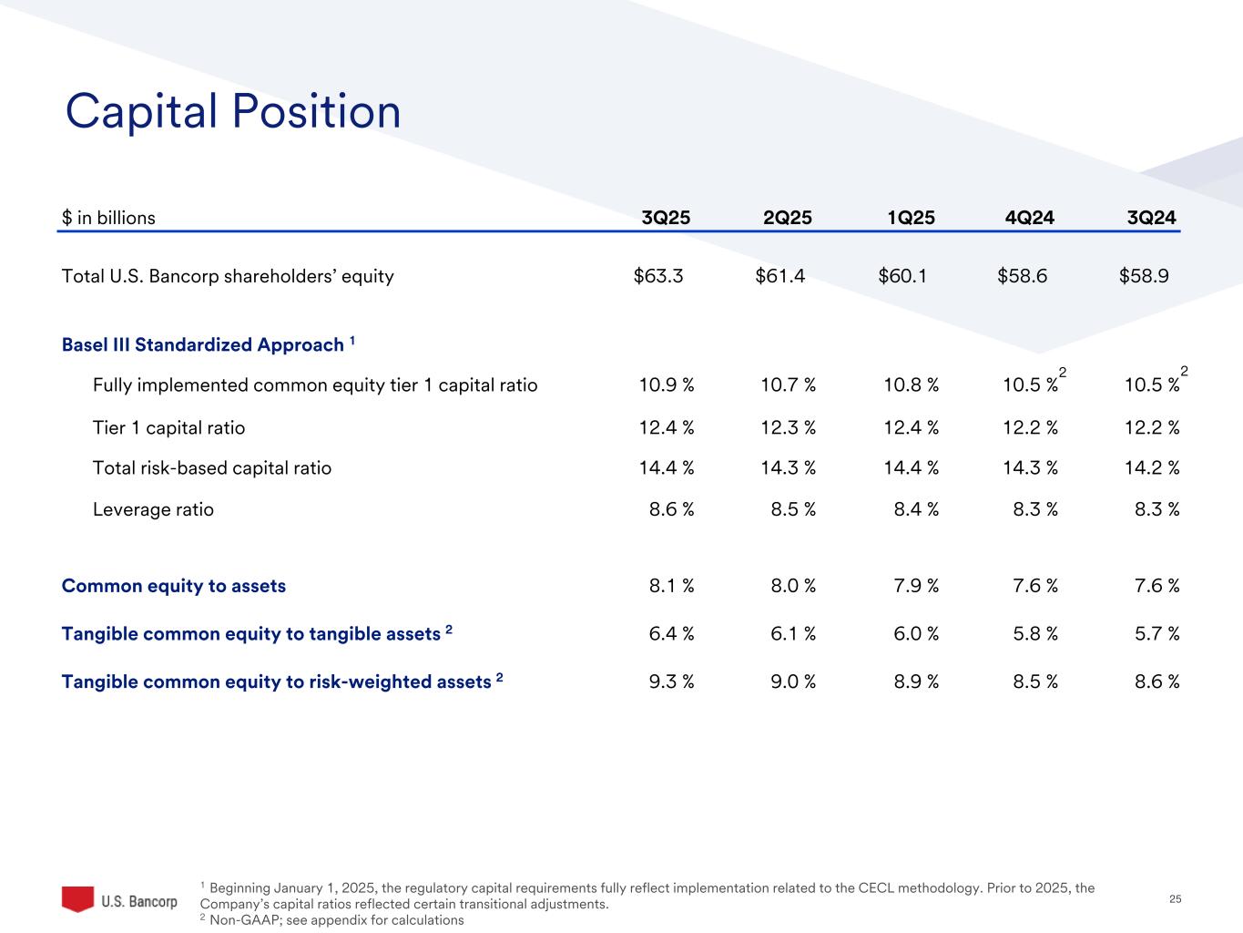 25©2025 U.S. Bank | Confidential Capital Position $ in billions 3Q25 2Q25 1Q25 4Q24 3Q24 Total U.S. Bancorp shareholders’ equity $63.3 $61.4 $60.1 $58.6 $58.9 Basel III Standardized Approach 1 Fully implemented common equity tier 1 capital ratio 10.9 % 10.7 % 10.8 % 10.5 % 10.5 % Tier 1 capital ratio 12.4 % 12.3 % 12.4 % 12.2 % 12.2 % Total risk-based capital ratio 14.4 % 14.3 % 14.4 % 14.3 % 14.2 % Leverage ratio 8.6 % 8.5 % 8.4 % 8.3 % 8.3 % Common equity to assets 8.1 % 8.0 % 7.9 % 7.6 % 7.6 % Tangible common equity to tangible assets 2 6.4 % 6.1 % 6.0 % 5.8 % 5.7 % Tangible common equity to risk-weighted assets 2 9.3 % 9.0 % 8.9 % 8.5 % 8.6 % 1 Beginning January 1, 2025, the regulatory capital requirements fully reflect implementation related to the CECL methodology. Prior to 2025, the Company’s capital ratios reflected certain transitional adjustments. 2 Non-GAAP; see appendix for calculations 2 2